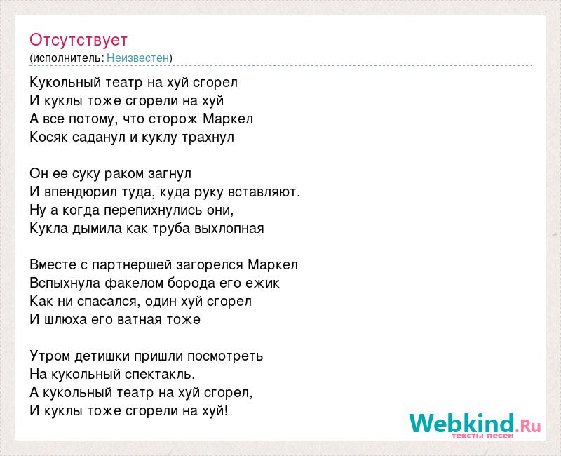 Кукольный театр на хуй сгорел И куклы тоже сгорели на хуй А все потому, что сторож Маркел Косяк саданул и куклу трахнул Он ее суку раком загнул И впендюрил туда, куда руку вставляют. Ну а когда перепихнулись они, Кукла дымила как труба выхлопная Вместе с партнершей загорелся Маркел Вспыхнула факелом борода его ежик Как ни спасался, один хуй сгорел И шлюха его ватная тоже Утром детишки пришли посмотреть На кукольный спектакль. А кукольный театр на хуй сгорел, И куклы тоже сгорели на хуй!
