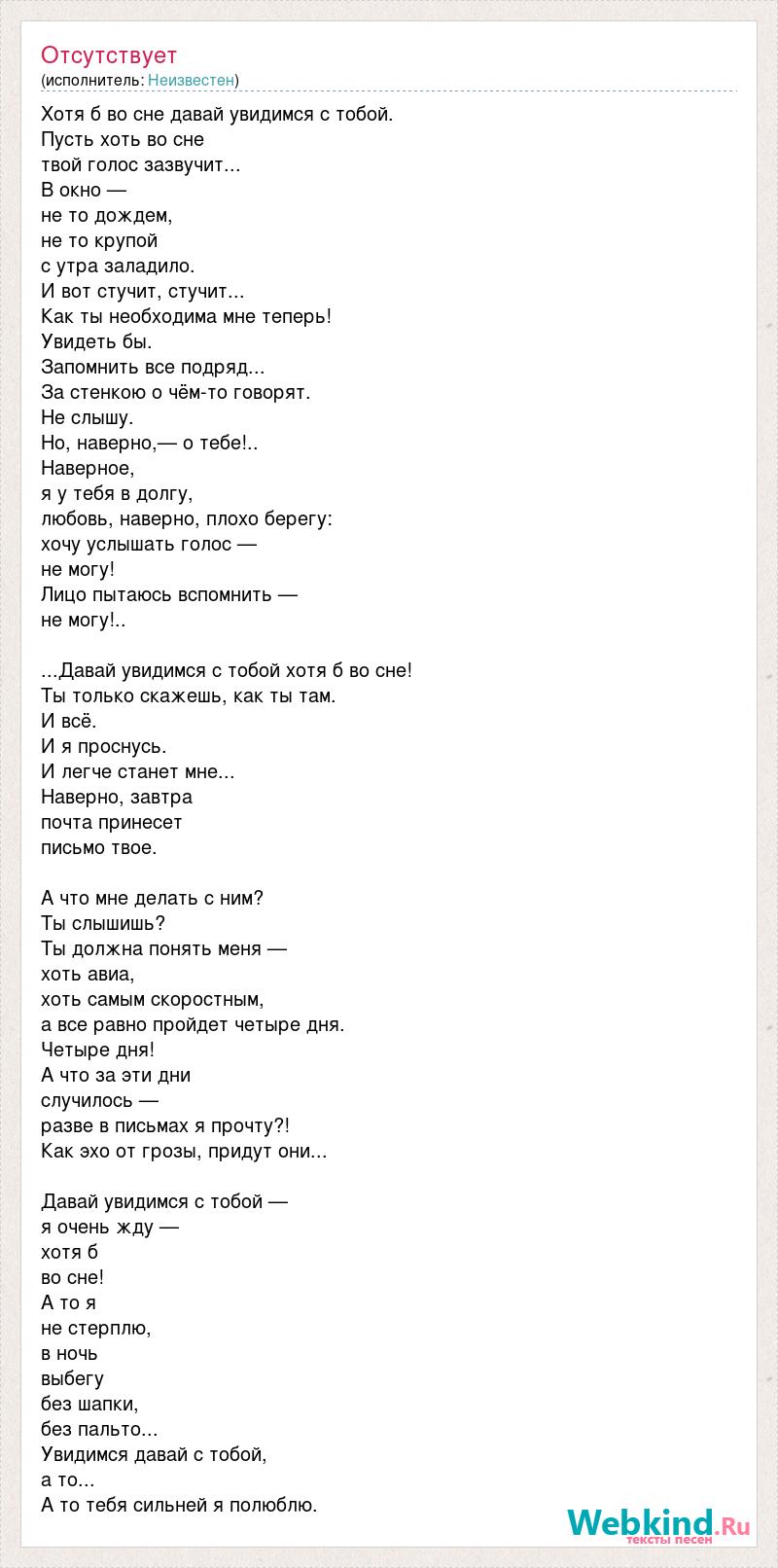 Хотя б во сне давай увидимся с тобой. Пусть хоть во сне твой голос зазвучит... В окно — не то дождем, не то крупой с утра заладило. И вот стучит, стучит... Как ты необходима мне теперь! Увидеть бы. Запомнить все подряд... За стенкою о чём-то говорят. Не слышу. Но, наверно,— о тебе!.. Наверное, я у тебя в долгу, любовь, наверно, плохо берегу: хочу услышать голос — не могу! Лицо пытаюсь вспомнить — не могу!.. ...Давай увидимся с тобой хотя б во сне! Ты только скажешь, как ты там. И всё. И я проснусь. И легче станет мне... Наверно, завтра почта принесет письмо твое. А что мне делать с ним? Ты слышишь? Ты должна понять меня — хоть авиа, хоть самым скоростным, а все равно пройдет четыре дня. Четыре дня! А что за эти дни случилось — разве в письмах я прочту?! Как эхо от грозы, придут они... Давай увидимся с тобой — я очень жду — хотя б во сне! А то я не стерплю, в ночь выбегу без шапки, без пальто... Увидимся давай с тобой, а то... А то тебя сильней я полюблю.