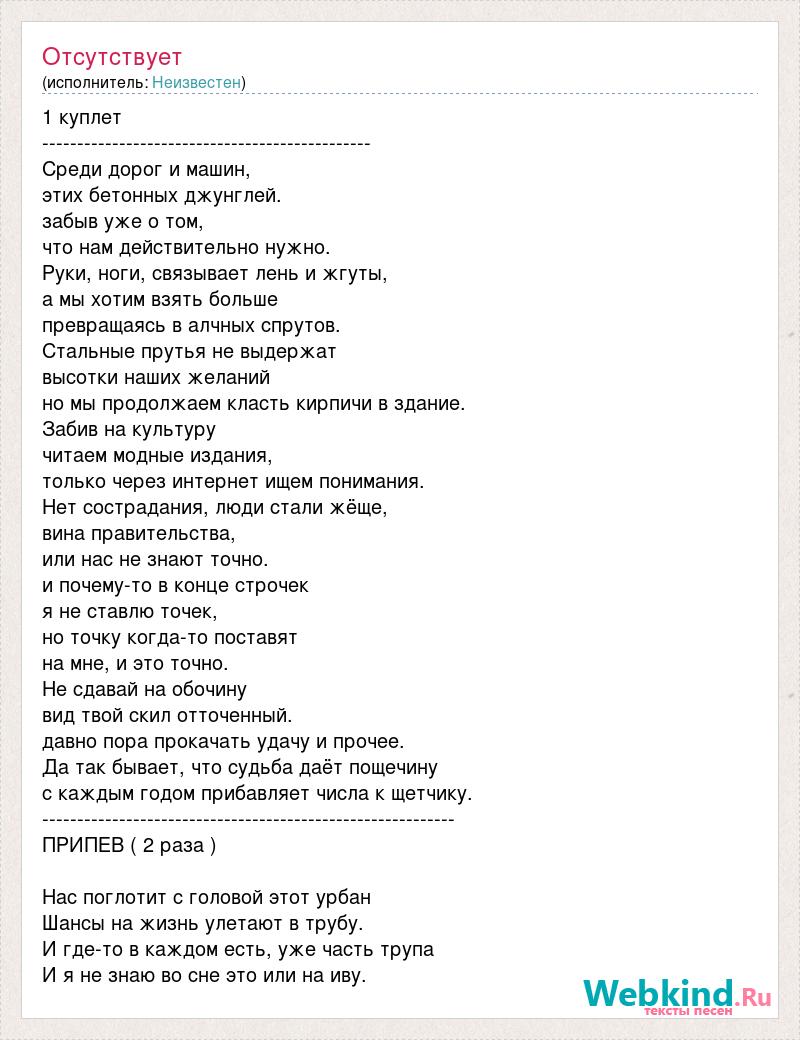 1 куплет ----------------------------------------------- Среди дорог и машин, этих бетонных джунглей. забыв уже о том, что нам действительно нужно. Руки, ноги, связывает лень и жгуты, а мы хотим взять больше превращаясь в алчных спрутов. Стальные прутья не выдержат высотки наших желаний но мы продолжаем класть кирпичи в здание. Забив на культуру читаем модные издания, только через интернет ищем понимания. Нет сострадания, люди стали жёще, вина правительства, или нас не знают точно. и почему-то в конце строчек я не ставлю точек, но точку когда-то поставят на мне, и это точно. Не сдавай на обочину вид твой скил отточенный. давно пора прокачать удачу и прочее. Да так бывает, что судьба даёт пощечину с каждым годом прибавляет числа к щетчику. ----------------------------------------------------------- ПРИПЕВ ( 2 раза ) Нас поглотит с головой этот урбан Шансы на жизнь улетают в трубу. И где-то в каждом есть, уже часть трупа И я не знаю во сне это или на иву.