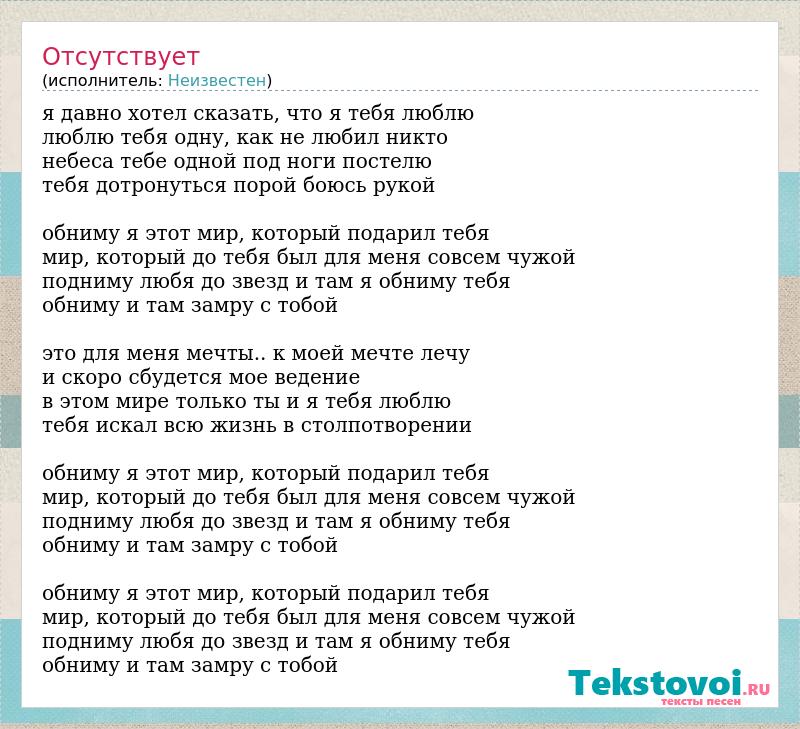 я давно хотел сказать, что я тебя люблю люблю тебя одну, как не любил никто небеса тебе одной под ноги постелю тебя дотронуться порой боюсь рукой обниму я этот мир, который подарил тебя мир, который до тебя был для меня совсем чужой подниму любя до звезд и там я обниму тебя обниму и там замру с тобой это для меня мечты.. к моей мечте лечу и скоро сбудется мое ведение в этом мире только ты и я тебя люблю тебя искал всю жизнь в столпотворении обниму я этот мир, который подарил тебя мир, который до тебя был для меня совсем чужой подниму любя до звезд и там я обниму тебя обниму и там замру с тобой обниму я этот мир, который подарил тебя мир, который до тебя был для меня совсем чужой подниму любя до звезд и там я обниму тебя обниму и там замру с тобой