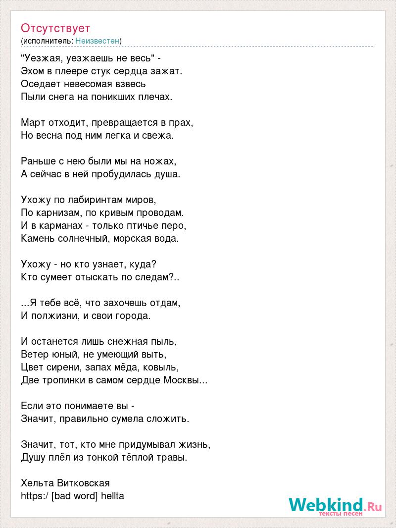 "Уезжая, уезжаешь не весь" - Эхом в плеере стук сердца зажат. Оседает невесомая взвесь Пыли снега на поникших плечах. Март отходит, превращается в прах, Но весна под ним легка и свежа. Раньше с нею были мы на ножах, А сейчас в ней пробудилась душа. Ухожу по лабиринтам миров, По карнизам, по кривым проводам. И в карманах - только птичье перо, Камень солнечный, морская вода. Ухожу - но кто узнает, куда? Кто сумеет отыскать по следам?.. ...Я тебе всё, что захочешь отдам, И полжизни, и свои города. И останется лишь снежная пыль, Ветер юный, не умеющий выть, Цвет сирени, запах мёда, ковыль, Две тропинки в самом сердце Москвы... Если это понимаете вы - Значит, правильно сумела сложить. Значит, тот, кто мне придумывал жизнь, Душу плёл из тонкой тёплой травы. Хельта Витковская https:/ [bad word] hellta