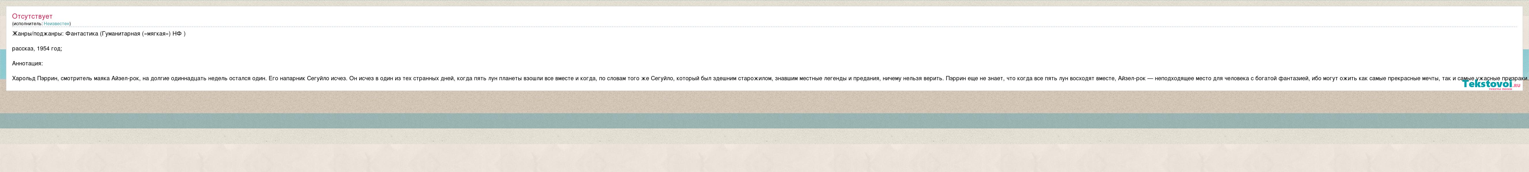 Жанры/поджанры: Фантастика (Гуманитарная («мягкая») НФ ) рассказ, 1954 год; Аннотация: Харольд Пэррин, смотритель маяка Айзел-рок, на долгие одиннадцать недель остался один. Его напарник Сегуйло исчез. Он исчез в один из тех странных дней, когда пять лун планеты взошли все вместе и когда, по словам того же Сегуйло, который был здешним старожилом, знавшим местные легенды и предания, ничему нельзя верить. Пэррин еще не знает, что когда все пять лун восходят вместе, Айзел-рок — неподходящее место для человека с богатой фантазией, ибо могут ожить как самые прекрасные мечты, так и самые ужасные призраки.