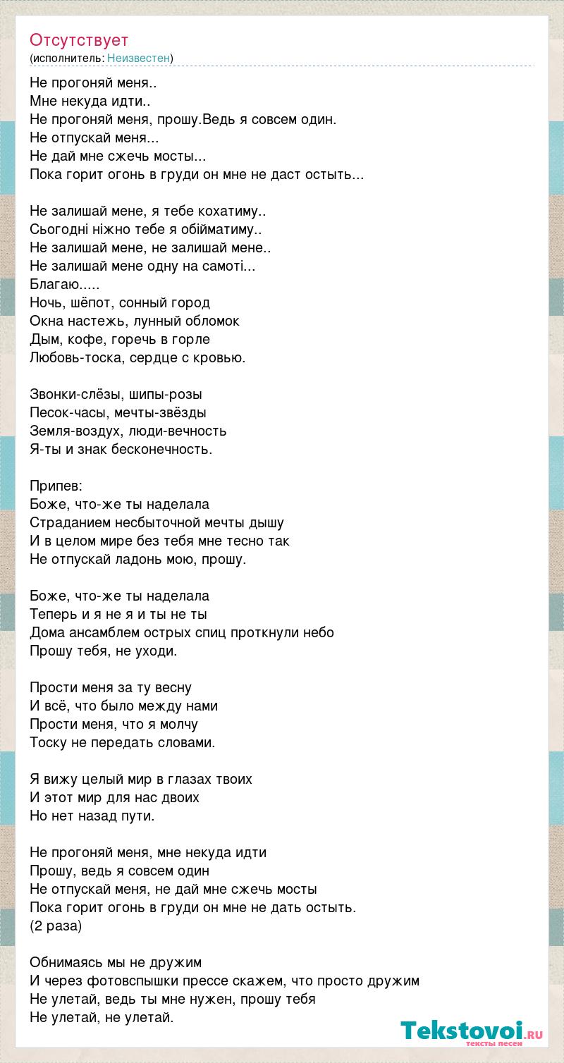 Не прогоняй меня.. Мне некуда идти.. Не прогоняй меня, прошу.Ведь я совсем один. Не отпускай меня... Не дай мне сжечь мосты... Пока горит огонь в груди он мне не даст остыть... Не залишай мене, я тебе кохатиму.. Сьогодні ніжно тебе я обійматиму.. Не залишай мене, не залишай мене.. Не залишай мене одну на самоті... Благаю..... Ночь, шёпот, сонный город Окна настежь, лунный обломок Дым, кофе, горечь в горле Любовь-тоска, сердце с кровью. Звонки-слёзы, шипы-розы Песок-часы, мечты-звёзды Земля-воздух, люди-вечность Я-ты и знак бесконечность. Припев: Боже, что-же ты наделала Страданием несбыточной мечты дышу И в целом мире без тебя мне тесно так Не отпускай ладонь мою, прошу. Боже, что-же ты наделала Теперь и я не я и ты не ты Дома ансамблем острых спиц проткнули небо Прошу тебя, не уходи. Прости меня за ту весну И всё, что было между нами Прости меня, что я молчу Тоску не передать словами. Я вижу целый мир в глазах твоих И этот мир для нас двоих Но нет назад пути. Не прогоняй меня, мне некуда идти Прошу, ведь я совсем один Не отпускай меня, не дай мне сжечь мосты Пока горит огонь в груди он мне не дать остыть. (2 раза) Обнимаясь мы не дружим И через фотовспышки прессе скажем, что просто дружим Не улетай, ведь ты мне нужен, прошу тебя Не улетай, не улетай.