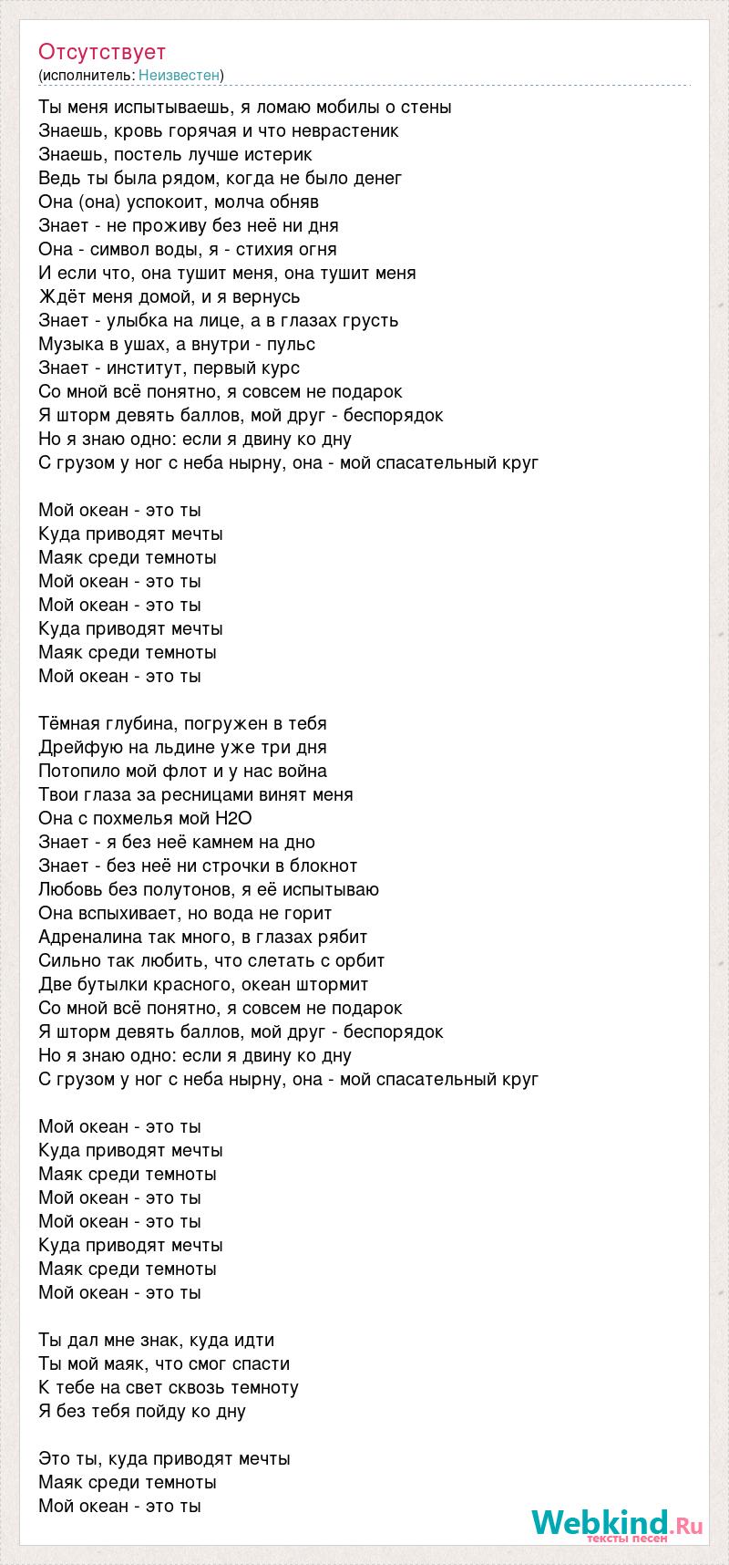 Ты меня испытываешь, я ломаю мобилы о стены Знаешь, кровь горячая и что неврастеник Знаешь, постель лучше истерик Ведь ты была рядом, когда не было денег Она (она) успокоит, молча обняв Знает - не проживу без неё ни дня Она - символ воды, я - стихия огня И если что, она тушит меня, она тушит меня Ждёт меня домой, и я вернусь Знает - улыбка на лице, а в глазах грусть Музыка в ушах, а внутри - пульс Знает - институт, первый курс Со мной всё понятно, я совсем не подарок Я шторм девять баллов, мой друг - беспорядок Но я знаю одно: если я двину ко дну С грузом у ног с неба нырну, она - мой спасательный круг Мой океан - это ты Куда приводят мечты Маяк среди темноты Мой океан - это ты Мой океан - это ты Куда приводят мечты Маяк среди темноты Мой океан - это ты Тёмная глубина, погружен в тебя Дрейфую на льдине уже три дня Потопило мой флот и у нас война Твои глаза за ресницами винят меня Она с похмелья мой H2O Знает - я без неё камнем на дно Знает - без неё ни строчки в блокнот Любовь без полутонов, я её испытываю Она вспыхивает, но вода не горит Адреналина так много, в глазах рябит Сильно так любить, что слетать с орбит Две бутылки красного, океан штормит Со мной всё понятно, я совсем не подарок Я шторм девять баллов, мой друг - беспорядок Но я знаю одно: если я двину ко дну С грузом у ног с неба нырну, она - мой спасательный круг Мой океан - это ты Куда приводят мечты Маяк среди темноты Мой океан - это ты Мой океан - это ты Куда приводят мечты Маяк среди темноты Мой океан - это ты Ты дал мне знак, куда идти Ты мой маяк, что смог спасти К тебе на свет сквозь темноту Я без тебя пойду ко дну Это ты, куда приводят мечты Маяк среди темноты Мой океан - это ты