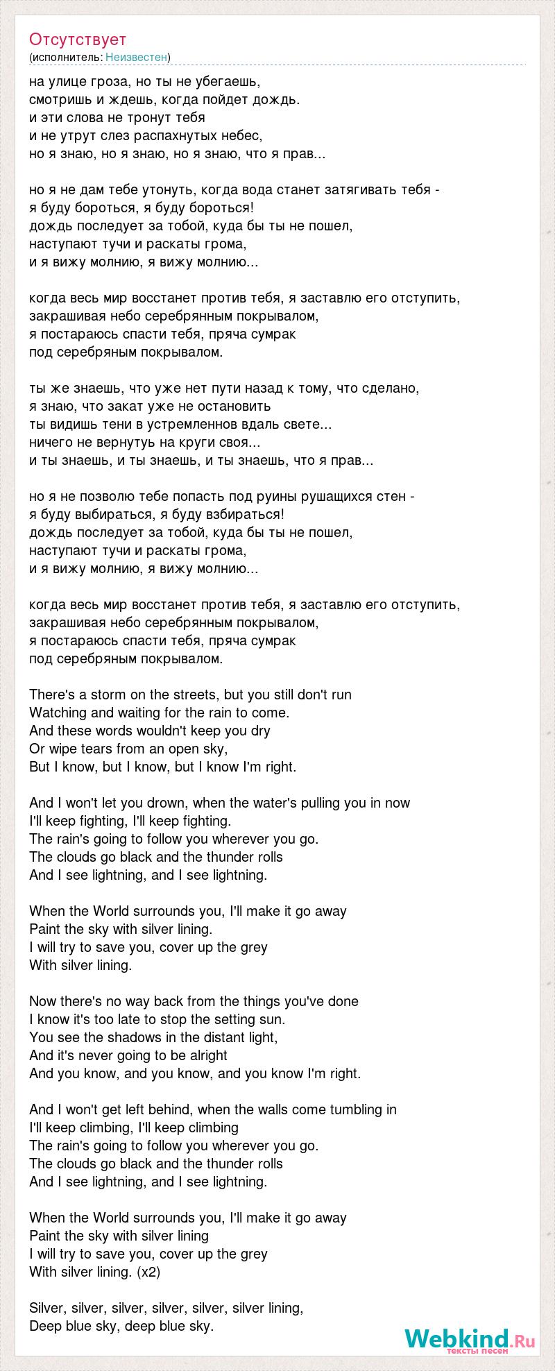 на улице гроза, но ты не убегаешь, смотришь и ждешь, когда пойдет дождь. и эти слова не тронут тебя и не утрут слез распахнутых небес, но я знаю, но я знаю, но я знаю, что я прав... но я не дам тебе утонуть, когда вода станет затягивать тебя - я буду бороться, я буду бороться! дождь последует за тобой, куда бы ты не пошел, наступают тучи и раскаты грома, и я вижу молнию, я вижу молнию... когда весь мир восстанет против тебя, я заставлю его отступить, закрашивая небо серебрянным покрывалом, я постараюсь спасти тебя, пряча сумрак под серебряным покрывалом. ты же знаешь, что уже нет пути назад к тому, что сделано, я знаю, что закат уже не остановить ты видишь тени в устремленнов вдаль свете... ничего не вернутуь на круги своя... и ты знаешь, и ты знаешь, и ты знаешь, что я прав... но я не позволю тебе попасть под руины рушащихся стен - я буду выбираться, я буду взбираться! дождь последует за тобой, куда бы ты не пошел, наступают тучи и раскаты грома, и я вижу молнию, я вижу молнию... когда весь мир восстанет против тебя, я заставлю его отступить, закрашивая небо серебрянным покрывалом, я постараюсь спасти тебя, пряча сумрак под серебряным покрывалом. There's a storm on the streets, but you still [bad word] Watching and waiting for the rain [bad word] And these words wouldn't keep you dry Or wipe tears from an open sky, But I know, but I know, but I know I'm right. And I won't let you drown, when the water's pulling you in now I'll keep fighting, I'll keep fighting. The rain's going to follow you wherever you go. The clouds go black and the thunder rolls And I see lightning, and I see lightning. When the World surrounds you, I'll make it go away Paint the sky with silver lining. I will try to save you, cover up the grey With silver lining. Now there's no way back from the things you've done I know it's too late to stop the setting sun. You see the shadows in the distant light, And it's never going to be alright And you know, and you know, and you know I'm right. And I won't get left behind, when the [bad word] tumbling in I'll keep climbing, I'll keep climbing The rain's going to follow you wherever you go. The clouds go black and the thunder rolls And I see lightning, and I see lightning. When the World surrounds you, I'll make it go away Paint the sky with silver lining I will try to save you, cover up the grey With silver lining. (x2) Silver, silver, silver, silver, silver, silver lining, Deep blue sky, deep blue sky.