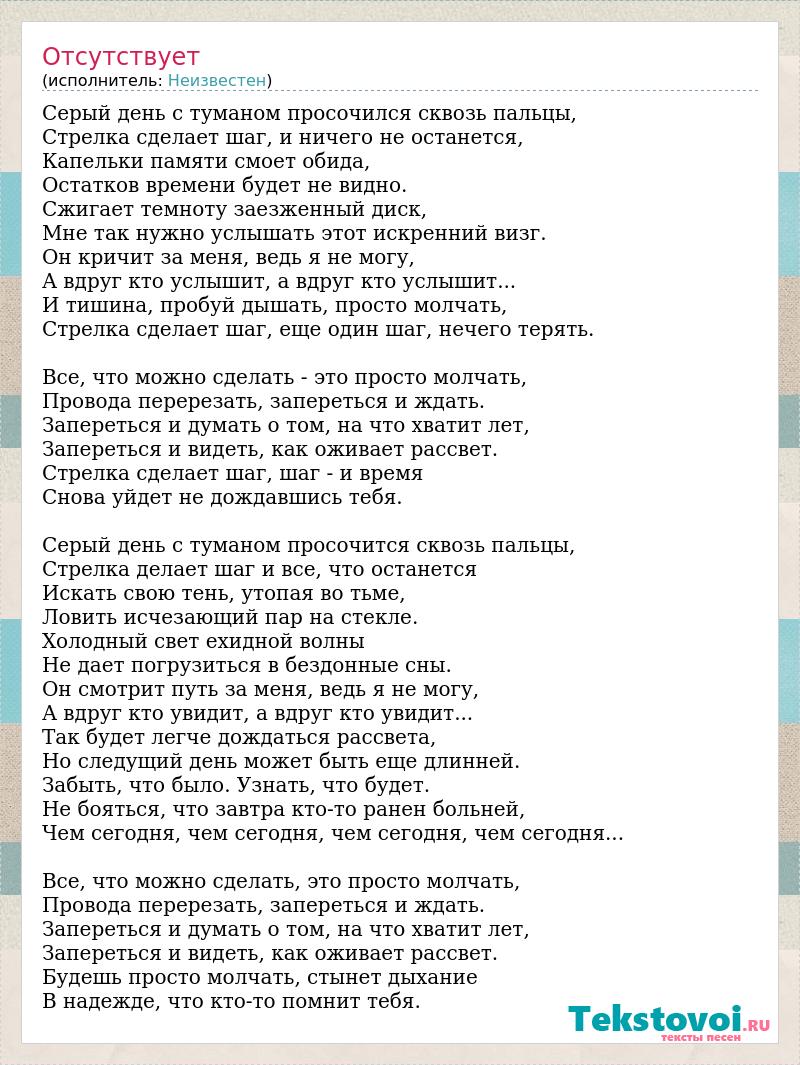 Серый день с туманом просочился сквозь пальцы, Стрелка сделает шаг, и ничего не останется, Капельки памяти смоет обида, Остатков времени будет не видно. Сжигает темноту заезженный диск, Мне так нужно услышать этот искренний визг. Он кричит за меня, ведь я не могу, А вдруг кто услышит, а вдруг кто услышит... И тишина, пробуй дышать, просто молчать, Стрелка сделает шаг, еще один шаг, нечего терять. Все, что можно сделать - это просто молчать, Провода перерезать, запереться и ждать. Запереться и думать о том, на что хватит лет, Запереться и видеть, как оживает рассвет. Стрелка сделает шаг, шаг - и время Снова уйдет не дождавшись тебя. Серый день с туманом просочится сквозь пальцы, Стрелка делает шаг и все, что останется Искать свою тень, утопая во тьме, Ловить исчезающий пар на стекле. Холодный свет ехидной волны Не дает погрузиться в бездонные сны. Он смотрит путь за меня, ведь я не могу, А вдруг кто увидит, а вдруг кто увидит... Так будет легче дождаться рассвета, Но следущий день может быть еще длинней. Забыть, что было. Узнать, что будет. Не бояться, что завтра кто-то ранен больней, Чем сегодня, чем сегодня, чем сегодня, чем сегодня... Все, что можно сделать, это просто молчать, Провода перерезать, запереться и ждать. Запереться и думать о том, на что хватит лет, Запереться и видеть, как оживает рассвет. Будешь просто молчать, стынет дыхание В надежде, что кто-то помнит тебя.