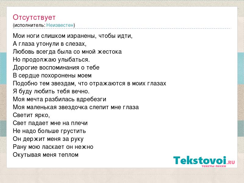 Мои ноги слишком изранены, чтобы идти, А глаза утонули в слезах, Любовь всегда была со мной жестока Но продолжаю улыбаться. Дорогие воспоминания о тебе В сердце похоронены моем Подобно тем звездам, что отражаются в моих глазах Я буду любить тебя вечно. Моя мечта разбилась вдребезги Моя маленькая звездочка слепит мне глаза Светит ярко, Свет падает мне на плечи Не надо больше грустить Он держит меня за руку Рану мою ласкает он нежно Окутывая меня теплом