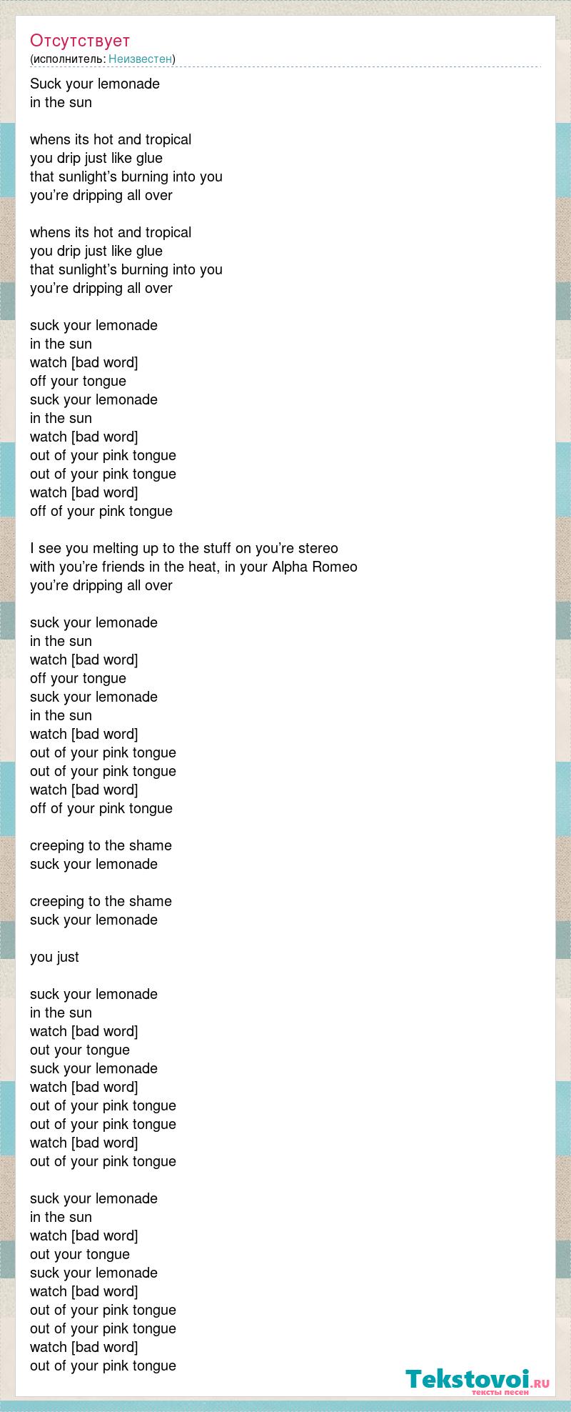 Suck your lemonade in the sun whens its hot and tropical you drip just like glue that sunlight’s burning into you you’re dripping all over whens its hot and tropical you drip just like glue that sunlight’s burning into you you’re dripping all over suck your lemonade in the sun watch [bad word] off your tongue suck your lemonade in the sun watch [bad word] out of your pink tongue out of your pink tongue watch [bad word] off of your pink tongue I see you melting up to the stuff on you’re stereo with you’re friends in the heat, in your Alpha Romeo you’re dripping all over suck your lemonade in the sun watch [bad word] off your tongue suck your lemonade in the sun watch [bad word] out of your pink tongue out of your pink tongue watch [bad word] off of your pink tongue creeping to the shame suck your lemonade creeping to the shame suck your lemonade you just suck your lemonade in the sun watch [bad word] out your tongue suck your lemonade watch [bad word] out of your pink tongue out of your pink tongue watch [bad word] out of your pink tongue suck your lemonade in the sun watch [bad word] out your tongue suck your lemonade watch [bad word] out of your pink tongue out of your pink tongue watch [bad word] out of your pink tongue