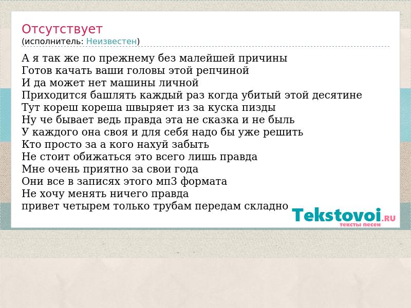 А я так же по прежнему без малейшей причины Готов качать ваши головы этой репчиной И да может нет машины личной Приходится башлять каждый раз когда убитый этой десятине Тут кореш кореша швыряет из за куска пизды Ну че бывает ведь правда эта не сказка и не быль У каждого она своя и для себя надо бы уже решить Кто просто за а кого нахуй забыть Не стоит обижаться это всего лишь правда Мне очень приятно за свои года Они все в записях этого мп3 формата Не хочу менять ничего правда привет четырем только трубам передам складно