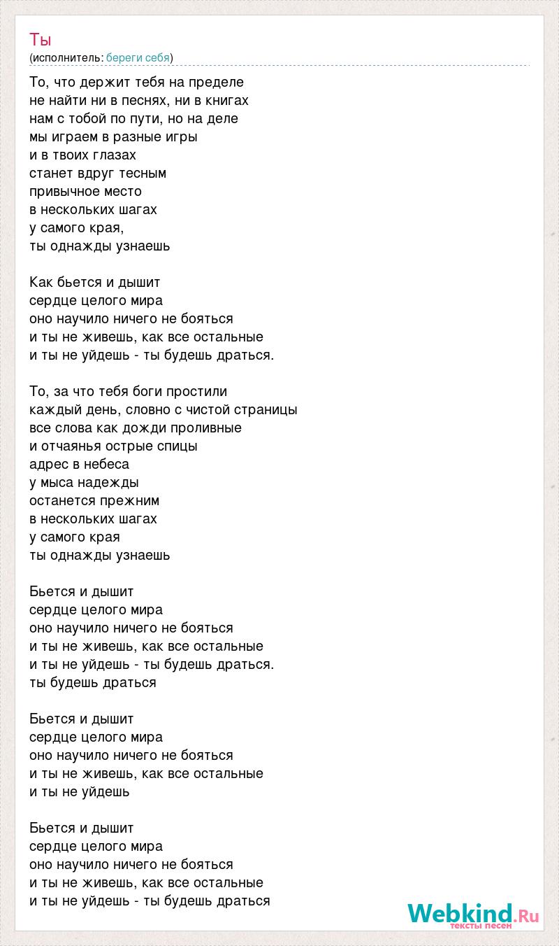 То, что держит тебя на пределе не найти ни в песнях, ни в книгах нам с тобой по пути, но на деле мы играем в разные игры и в твоих глазах станет вдруг тесным привычное место в нескольких шагах у самого края, ты однажды узнаешь Как бьется и дышит сердце целого мира оно научило ничего не бояться и ты не живешь, как все остальные и ты не уйдешь - ты будешь драться. То, за что тебя боги простили каждый день, словно с чистой страницы все слова как дожди проливные и отчаянья острые спицы адрес в небеса у мыса надежды останется прежним в нескольких шагах у самого края ты однажды узнаешь Бьется и дышит сердце целого мира оно научило ничего не бояться и ты не живешь, как все остальные и ты не уйдешь - ты будешь драться. ты будешь драться Бьется и дышит сердце целого мира оно научило ничего не бояться и ты не живешь, как все остальные и ты не уйдешь Бьется и дышит сердце целого мира оно научило ничего не бояться и ты не живешь, как все остальные и ты не уйдешь - ты будешь драться