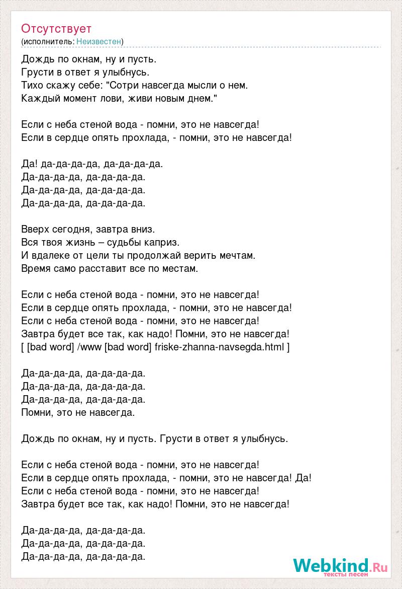 Дождь по окнам, ну и пусть. Грусти в ответ я улыбнусь. Тихо скажу себе: "Сотри навсегда мысли о нем. Каждый момент лови, живи новым днем." Если с неба стеной вода - помни, это не навсегда! Если в сердце опять прохлада, - помни, это не навсегда! Да! да-да-да-да, да-да-да-да. Да-да-да-да, да-да-да-да. Да-да-да-да, да-да-да-да. Да-да-да-да, да-да-да-да. Вверх сегодня, завтра вниз. Вся твоя жизнь – судьбы каприз. И вдалеке от цели ты продолжай верить мечтам. Время само расставит все по местам. Если с неба стеной вода - помни, это не навсегда! Если в сердце опять прохлада, - помни, это не навсегда! Если с неба стеной вода - помни, это не навсегда! Завтра будет все так, как надо! Помни, это не навсегда! [ [bad word] /www [bad word] friske-zhanna-navsegda.html ] Да-да-да-да, да-да-да-да. Да-да-да-да, да-да-да-да. Да-да-да-да, да-да-да-да. Помни, это не навсегда. Дождь по окнам, ну и пусть. Грусти в ответ я улыбнусь. Если с неба стеной вода - помни, это не навсегда! Если в сердце опять прохлада, - помни, это не навсегда! Да! Если с неба стеной вода - помни, это не навсегда! Завтра будет все так, как надо! Помни, это не навсегда! Да-да-да-да, да-да-да-да. Да-да-да-да, да-да-да-да. Да-да-да-да, да-да-да-да.