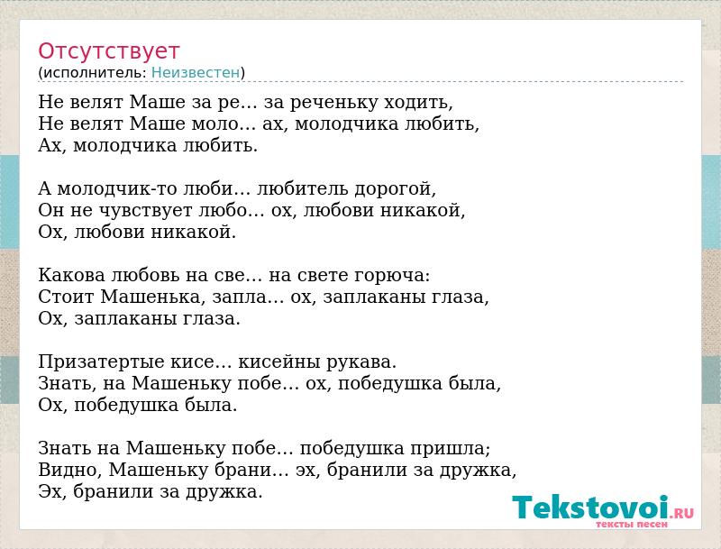 Не велят Маше за ре… за реченьку ходить, Не велят Маше моло… ах, молодчика любить, Ах, молодчика любить. А молодчик-то люби… любитель дорогой, Он не чувствует любо… ох, любови никакой, Ох, любови никакой. Какова любовь на све… на свете горюча: Стоит Машенька, запла… ох, заплаканы глаза, Ох, заплаканы глаза. Призатертые кисе… кисейны рукава. Знать, на Машеньку побе… ох, победушка была, Ох, победушка была. Знать на Машеньку побе… победушка пришла; Видно, Машеньку брани… эх, бранили за дружка, Эх, бранили за дружка.