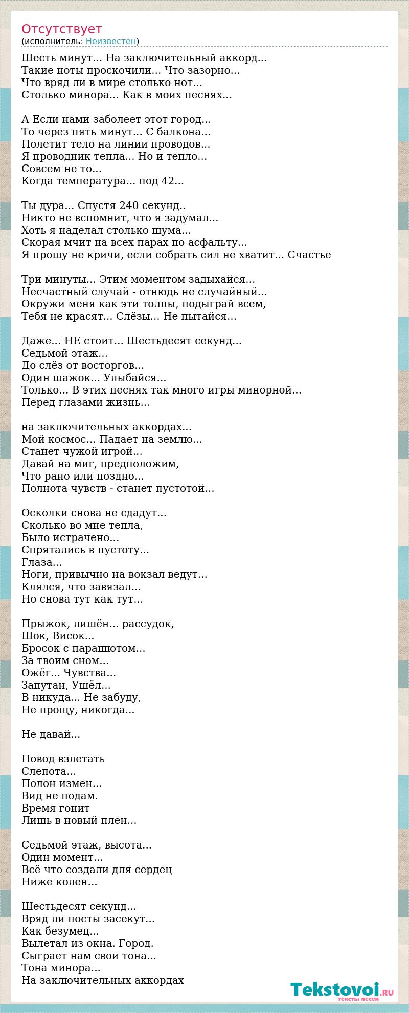 Шесть минут... На заключительный аккорд... Такие ноты проскочили... Что зазорно... Что вряд ли в мире столько нот... Столько минора... Как в моих песнях... А Если нами заболеет этот город... То через пять минут... С балкона... Полетит тело на линии проводов... Я проводник тепла... Но и тепло... Совсем не то... Когда температура... под 42... Ты дура... Спустя 240 секунд.. Никто не вспомнит, что я задумал... Хоть я наделал столько шума... Скорая мчит на всех парах по асфальту... Я прошу не кричи, если собрать сил не хватит... Счастье Три минуты... Этим моментом задыхайся... Несчастный случай - отнюдь не случайный... Окружи меня как эти толпы, подыграй всем, Тебя не красят... Слёзы... Не пытайся... Даже... НЕ стоит... Шестьдесят секунд... Седьмой этаж... До слёз от восторгов... Один шажок... Улыбайся... Только... В этих песнях так много игры минорной... Перед глазами жизнь... на заключительных аккордах... Мой космос... Падает на землю... Станет чужой игрой... Давай на миг, предположим, Что рано или поздно... Полнота чувств - станет пустотой... Осколки снова не сдадут... Сколько во мне тепла, Было истрачено... Спрятались в пустоту... Глаза... Ноги, привычно на вокзал ведут... Клялся, что завязал... Но снова тут как тут... Прыжок, лишён... рассудок, Шок, Висок... Бросок с парашютом... За твоим сном... Ожёг... Чувства... Запутан, Ушёл... В никуда... Не забуду, Не прощу, никогда... Не давай... Повод взлетать Слепота... Полон измен... Вид не подам. Время гонит Лишь в новый плен... Седьмой этаж, высота... Один момент... Всё что создали для сердец Ниже колен... Шестьдесят секунд... Вряд ли посты засекут... Как безумец... Вылетал из окна. Город. Сыграет нам свои тона... Тона минора... На заключительных аккордах