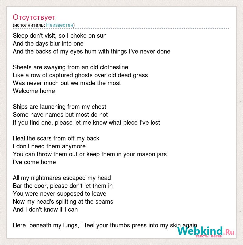 Sleep don't visit, so I choke on sun And the days blur into one And the backs of my eyes hum with things I've never done Sheets are swaying from an old clothesline Like a row of captured ghosts over old dead grass Was never much but we made the most [bad word] home Ships are launching from my chest Some have names but most do not If you find one, please let me know what piece I've lost Heal the scars from off my back I don't need them anymore You can throw them out or keep them in your mason jars [bad word] home All my nightmares escaped my head Bar the door, please don't let them in You were never supposed to leave Now my head's splitting at the seams And I don't know if I can Here, beneath my lungs, I feel your thumbs press into my skin again