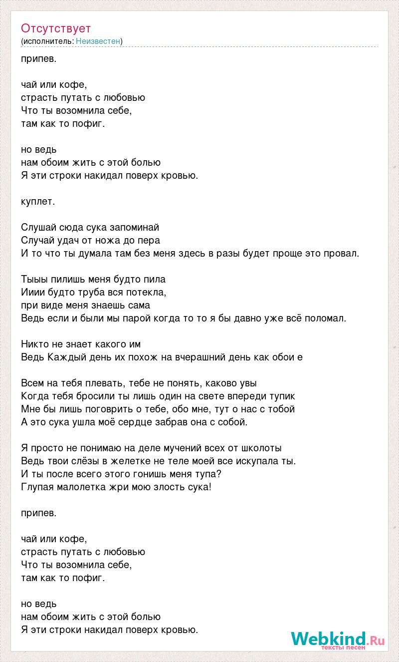 припев. чай или кофе, страсть путать с любовью Что ты возомнила себе, там как то пофиг. но ведь нам обоим жить с этой болью Я эти строки накидал поверх кровью. куплет. Слушай сюда сука запоминай Случай удач от ножа до пера И то что ты думала там без меня здесь в разы будет проще это провал. Тыыы пилишь меня будто пила Ииии будто труба вся потекла, при виде меня знаешь сама Ведь если и были мы парой когда то то я бы давно уже всё поломал. Никто не знает какого им Ведь Каждый день их похож на вчерашний день как обои е Всем на тебя плевать, тебе не понять, каково увы Когда тебя бросили ты лишь один на свете впереди тупик Мне бы лишь поговрить о тебе, обо мне, тут о нас с тобой А это сука ушла моё сердце забрав она с собой. Я просто не понимаю на деле мучений всех от школоты Ведь твои слёзы в желетке не теле моей все искупала ты. И ты после всего этого гонишь меня тупа? Глупая малолетка жри мою злость сука! припев. чай или кофе, страсть путать с любовью Что ты возомнила себе, там как то пофиг. но ведь нам обоим жить с этой болью Я эти строки накидал поверх кровью.