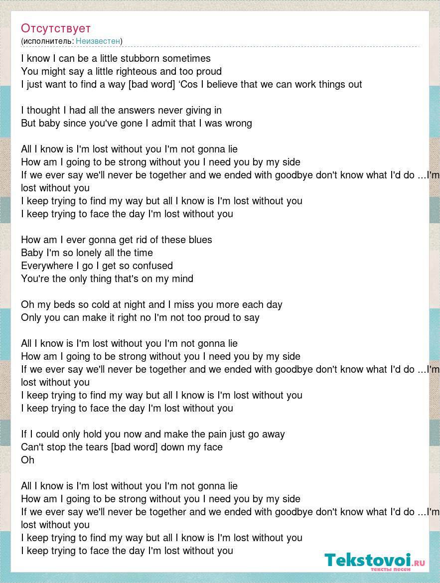 I know I can be a little stubborn sometimes You might say a little righteous and too proud I just want to find a way [bad word] ‘Cos I believe that we can work things out I thought I had all the answers never giving in But baby since you've gone I admit that I was wrong All I know is I'm lost without you I'm not gonna lie How am I going to be strong without you I need you by my side If we ever say we'll never be together and we ended with goodbye don't know what I'd do ...I'm lost without you I keep trying to find my way but all I know is I'm lost without you I keep trying to face the day I'm lost without you How am I ever gonna get rid of these blues Baby I'm so lonely all the time Everywhere I go I get so confused You're the only thing that's on my mind Oh my beds so cold at night and I miss you more each day Only you can make it right no I'm not too proud to say All I know is I'm lost without you I'm not gonna lie How am I going to be strong without you I need you by my side If we ever say we'll never be together and we ended with goodbye don't know what I'd do ...I'm lost without you I keep trying to find my way but all I know is I'm lost without you I keep trying to face the day I'm lost without you If I could only hold you now and make the pain just go away Can't stop the tears [bad word] down my face Oh All I know is I'm lost without you I'm not gonna lie How am I going to be strong without you I need you by my side If we ever say we'll never be together and we ended with goodbye don't know what I'd do ...I'm lost without you I keep trying to find my way but all I know is I'm lost without you I keep trying to face the day I'm lost without you