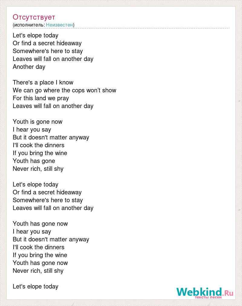 Let's elope today Or find a secret hideaway Somewhere's here to stay Leaves will fall on another day Another day There's a place I know We can go where the cops won’t show For this land we pray Leaves will fall on another day Youth is gone now I hear you say But it doesn't matter anyway I'll cook the dinners If you bring the wine Youth has gone Never rich, still shy Let's elope today Or find a secret hideaway Somewhere's here to stay Leaves will fall on another day Youth has gone now I hear you say But it doesn't matter anyway I'll cook the dinners If you bring the wine Youth has gone now Never rich, still shy Let's elope today