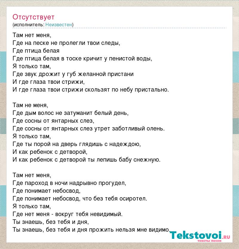 Там нет меня, Где на песке не пролегли твои следы, Где птица белая Где птица белая в тоске кричит у пенистой воды, Я только там, Где звук дрожит у губ желанной пристани И где глаза твои стрижи, И где глаза твои стрижи скользят по небу пристально. Там не меня, Где дым волос не затуманит белый день, Где сосны от янтарных слез, Где сосны от янтарных слез утрет заботливый олень. Я только там, Где ты порой на дверь глядишь с надеждою, И как ребенок с детворой, И как ребенок с детворой ты лепишь бабу снежную. Там нет меня, Где пароход в ночи надрывно прогудел, Где понимает небосвод, Где понимает небосвод, что без тебя осиротел. Я только там, Где нет меня - вокруг тебя невидимый. Ты знаешь, без тебя и дня, Ты знаешь, без тебя и дня прожить нельзя мне видимо.