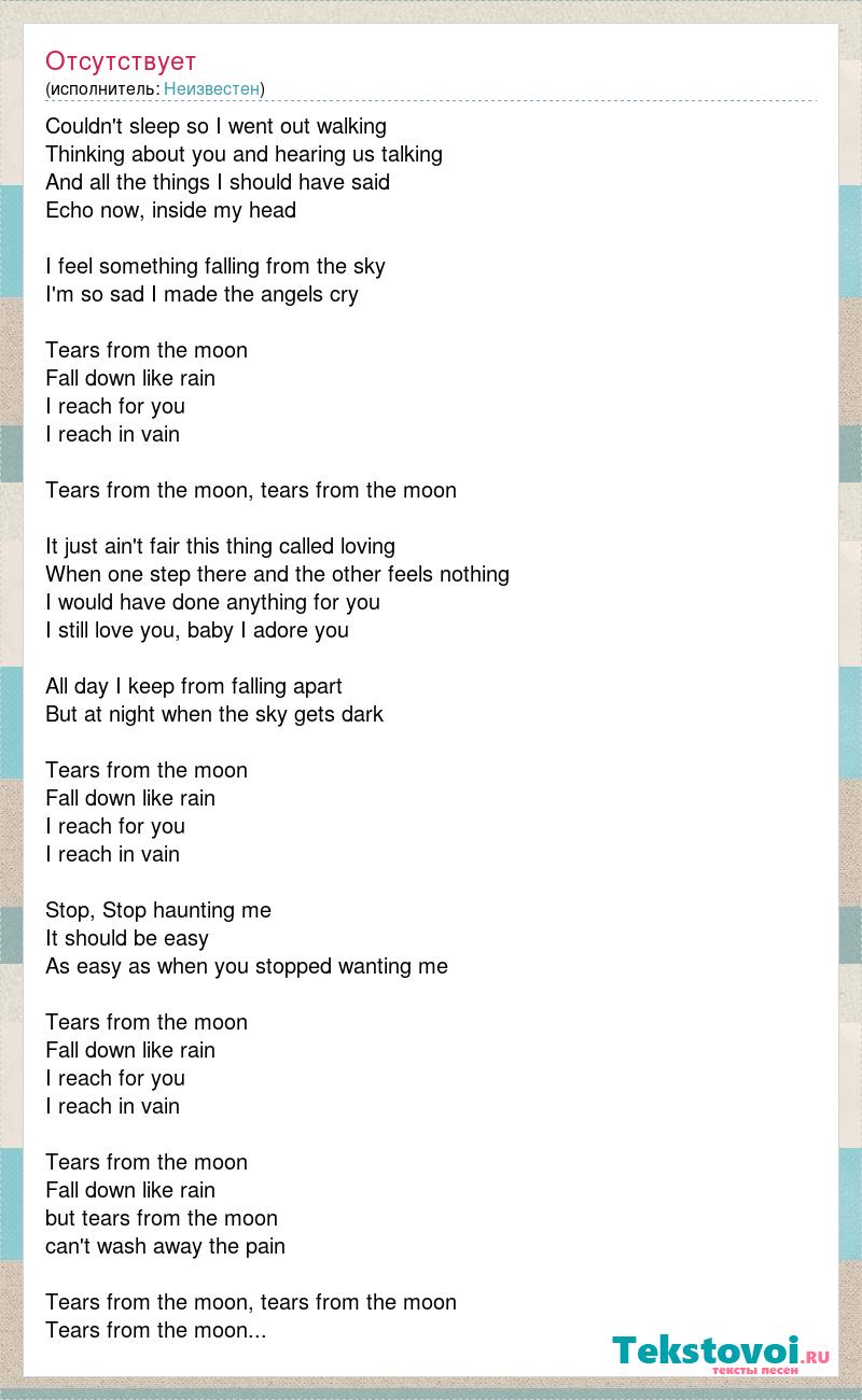 Couldn't sleep so I went out walking Thinking about you and hearing us talking And all the things I should have said Echo now, inside my head I feel something falling from the sky I'm so sad I made the angels cry Tears from the moon Fall down like rain I reach for you I reach in vain Tears from the moon, tears from the moon It just ain't fair this thing called loving When one step there and the other feels nothing I would have done anything for you I still love you, baby I adore you All day I keep from falling apart But at night when the sky gets dark Tears from the moon Fall down like rain I reach for you I reach in vain Stop, Stop haunting me It should be easy As easy as when you stopped wanting me Tears from the moon Fall down like rain I reach for you I reach in vain Tears from the moon Fall down like rain but tears from the moon can't wash away the pain Tears from the moon, tears from the moon Tears from the moon...