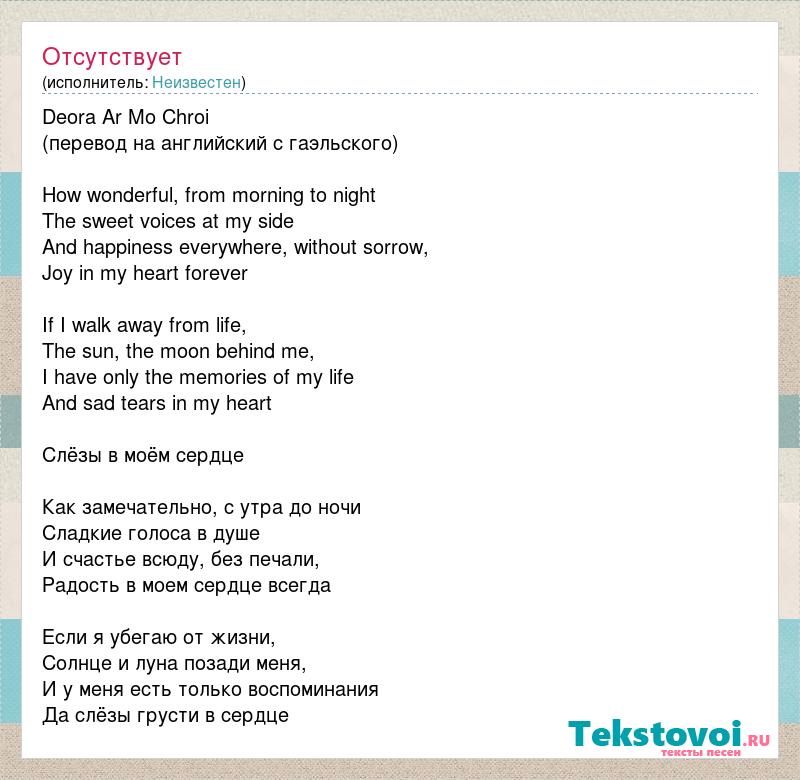 Deora Ar Mo Chroi (перевод на английский с гаэльского) How wonderful, from morning to night The sweet voices at my side And happiness everywhere, without sorrow, Joy in my heart forever If I walk away from life, The sun, the moon behind me, I have only the memories of my life And sad tears in my heart Слёзы в моём сердце Как замечательно, с утра до ночи Сладкие голоса в душе И счастье всюду, без печали, Радость в моем сердце всегда Если я убегаю от жизни, Солнце и луна позади меня, И у меня есть только воспоминания Да слёзы грусти в сердце