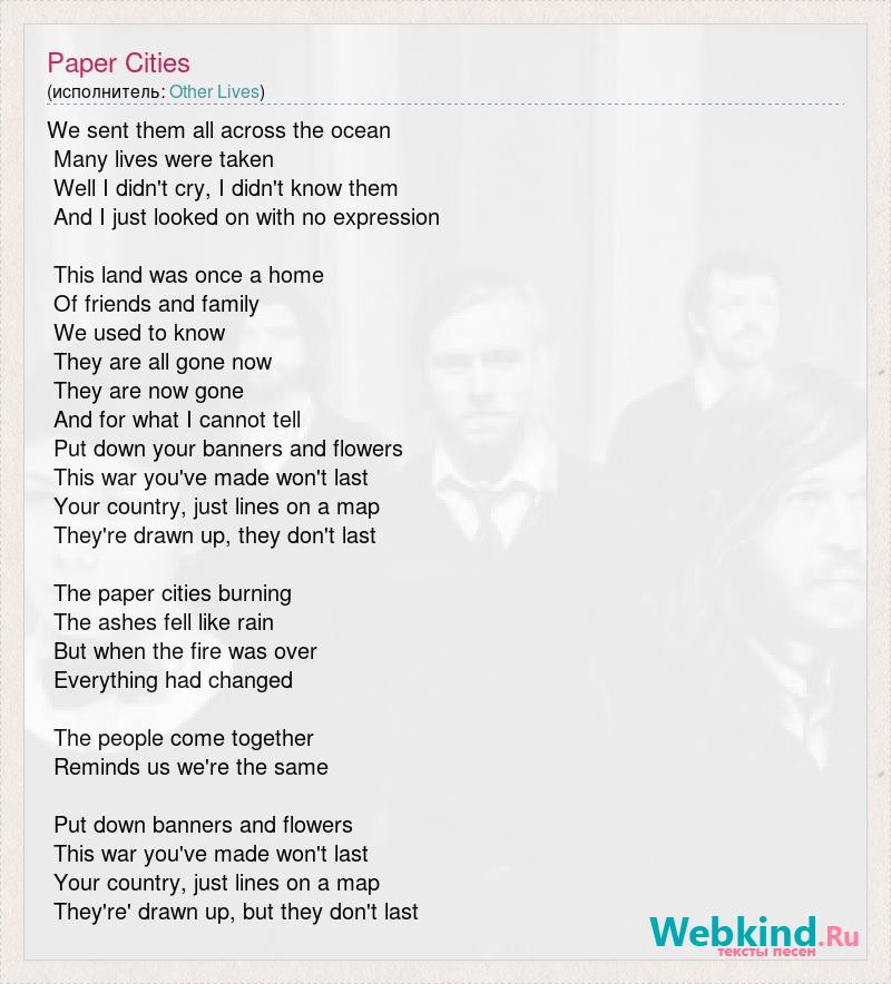 We sent them all across the ocean Many lives were taken Well I didn't cry, I didn't know them And I just looked on with no expression This land was once a home Of friends and family We used to know They are all gone now They are now gone And for what I cannot tell Put down your banners and flowers This war you've made won't last Your country, just lines on a map They're drawn up, they don't last The paper cities burning The ashes fell like rain But when the fire was over Everything had changed The [bad word] together Reminds us we're the same Put down banners and flowers This war you've made won't last Your country, just lines on a map They're' drawn up, but they don't last