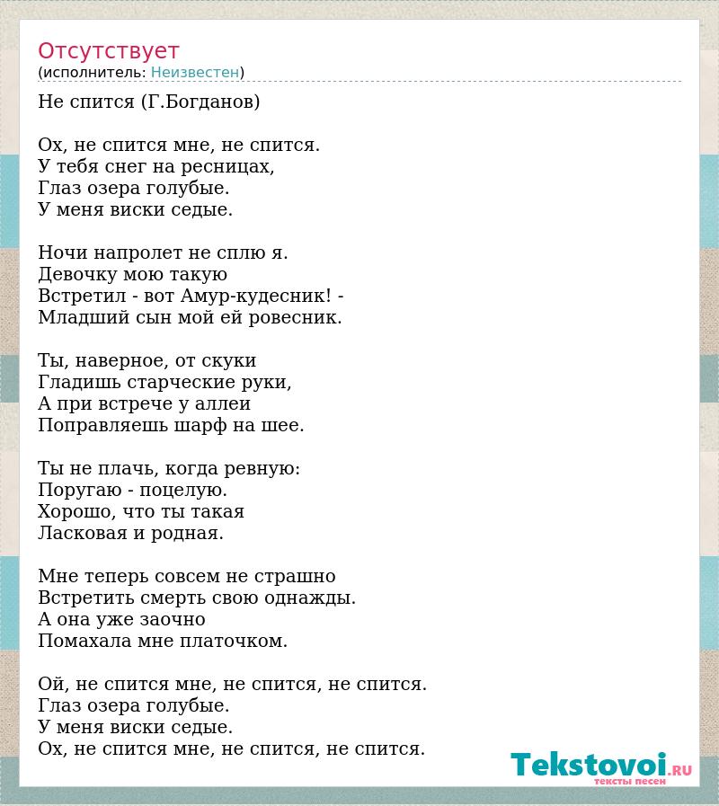 Не спится (Г.Богданов) Ох, не спится мне, не спится. У тебя снег на ресницах, Глаз озера голубые. У меня виски седые. Ночи напролет не сплю я. Девочку мою такую Встретил - вот Амур-кудесник! - Младший сын мой ей ровесник. Ты, наверное, от скуки Гладишь старческие руки, А при встрече у аллеи Поправляешь шарф на шее. Ты не плачь, когда ревную: Поругаю - поцелую. Хорошо, что ты такая Ласковая и родная. Мне теперь совсем не страшно Встретить смерть свою однажды. А она уже заочно Помахала мне платочком. Ой, не спится мне, не спится, не спится. Глаз озера голубые. У меня виски седые. Ох, не спится мне, не спится, не спится.