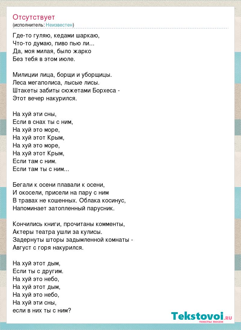 Где-то гуляю, кедами шаркаю, Что-то думаю, пиво пью ли... Да, моя милая, было жарко Без тебя в этом июле. Милиции лица, борщи и уборщицы. Леса мегаполиса, лысые лисы. Штакеты забиты сюжетами Борхеса - Этот вечер накурился. На хуй эти сны, Если в снах ты с ним, На хуй это море, На хуй этот Крым, На хуй это море, На хуй этот Крым, Если там с ним. Если там ты с ним... Бегали к осени плавали к осени, И окосели, присели на пару с ним В травах не кошенных. Облака косинус, Напоминает затопленный парусник. Кончились книги, прочитаны комменты, Актеры театра ушли за кулисы. Задернуты шторы задымленной комнаты - Август с горя накурился. На хуй этот дым, Если ты с другим. На хуй это небо, На хуй этот дым, На хуй это небо, На хуй эти сны, если в них ты с ним?