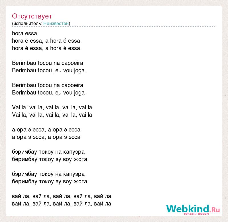 hora essa hora é essa, a hora é essa hora é essa, a hora é essa Berimbau tocou na capoeira Berimbau tocou, eu vou joga Berimbau tocou na capoeira Berimbau tocou, eu vou joga Vai la, vai la, vai la, vai la, vai la Vai la, vai la, vai la, vai la, vai la а ора э эсса, а ора э эсса а ора э эсса, а ора э эсса бэримбау токоу на капуэра беримбау токоу эу воу жога бэримбау токоу на капуэра беримбау токоу эу воу жога вай ла, вай ла, вай ла, вай ла, вай ла вай ла, вай ла, вай ла, вай ла, вай ла
