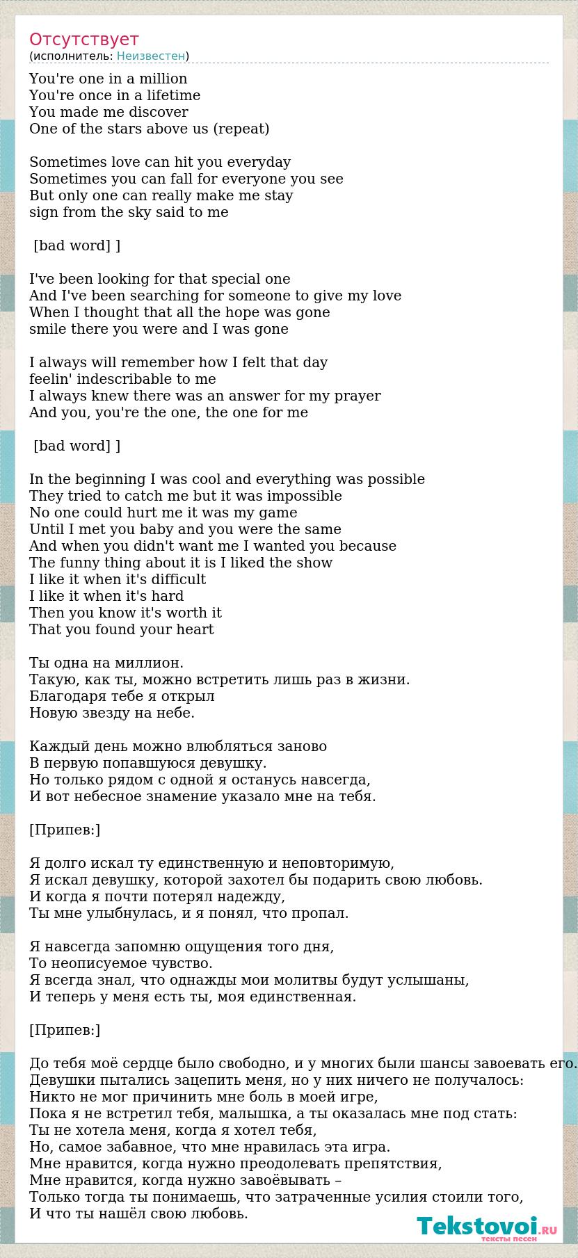 You're one in a million You're once in a lifetime You made me discover One of the stars above us (repeat) Sometimes love can hit you everyday Sometimes you can fall for everyone you see But only one can really make me stay sign from the sky said to me [bad word] ] I've been looking for that special one And I've been searching for someone to give my love When I thought that all the hope was gone smile there you were and I was gone I always will remember how I felt that day feelin' indescribable to me I always knew there was an answer for my prayer And you, you're the one, the one for me [bad word] ] In the beginning I was cool and everything was possible They tried to catch me but it was impossible No one could hurt me it was my game Until I met you baby and you were the same And when you didn't want me I wanted you because The funny thing about it is I liked the show I like it when it's difficult I like it when it's hard Then you know it's worth it That you found your heart Ты одна на миллион. Такую, как ты, можно встретить лишь раз в жизни. Благодаря тебе я открыл Новую звезду на небе. Каждый день можно влюбляться заново В первую попавшуюся девушку. Но только рядом с одной я останусь навсегда, И вот небесное знамение указало мне на тебя. [Припев:] Я долго искал ту единственную и неповторимую, Я искал девушку, которой захотел бы подарить свою любовь. И когда я почти потерял надежду, Ты мне улыбнулась, и я понял, что пропал. Я навсегда запомню ощущения того дня, То неописуемое чувство. Я всегда знал, что однажды мои молитвы будут услышаны, И теперь у меня есть ты, моя единственная. [Припев:] До тебя моё сердце было свободно, и у многих были шансы завоевать его. Девушки пытались зацепить меня, но у них ничего не получалось: Никто не мог причинить мне боль в моей игре, Пока я не встретил тебя, малышка, а ты оказалась мне под стать: Ты не хотела меня, когда я хотел тебя, Но, самое забавное, что мне нравилась эта игра. Мне нравится, когда нужно преодолевать препятствия, Мне нравится, когда нужно завоёвывать – Только тогда ты понимаешь, что затраченные усилия стоили того, И что ты нашёл свою любовь.