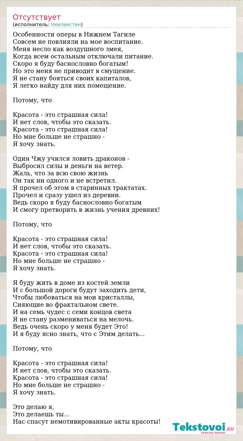 Особенности оперы в Нижнем Тагиле Совсем не повлияли на мое воспитание. Меня несло как воздушного змея, Когда всем остальным отключали питание. Скоро я буду баснословно богатым! Но это меня не приводит в смущение. Я не стану бояться своих капиталов, Я легко найду для них помещение. Потому, что Красота - это страшная сила! И нет слов, чтобы это сказать. Красота - это страшная сила! Но мне больше не страшно - Я хочу знать. Один Чжу учился ловить драконов - Выбросил силы и деньги на ветер. Жаль, что за всю свою жизнь Он так ни одного и не встретил. Я прочел об этом в старинных трактатах. Прочел и сразу ушел из деревни. Ведь скоро я буду баснословно богатым И смогу претворить в жизнь учения древних! Потому, что Красота - это страшная сила! И нет слов, чтобы это сказать. Красота - это страшная сила! Но мне больше не страшно - Я хочу знать. Я буду жить в доме из костей земли И с большой дороги будут заходить дети, Чтобы любоваться на мои кристаллы, Сияющие во фрактальном свете. И на семь чудес с семи концов света Я не стану размениваться на мелочь. Ведь очень скоро у меня будет Это! И я буду ясно знать, что с Этим делать... Потому, что Красота - это страшная сила! И нет слов, чтобы это сказать. Красота - это страшная сила! Но мне больше не страшно - Я хочу знать. Это делаю я, Это делаешь ты... Нас спасут немотивированные акты красоты!