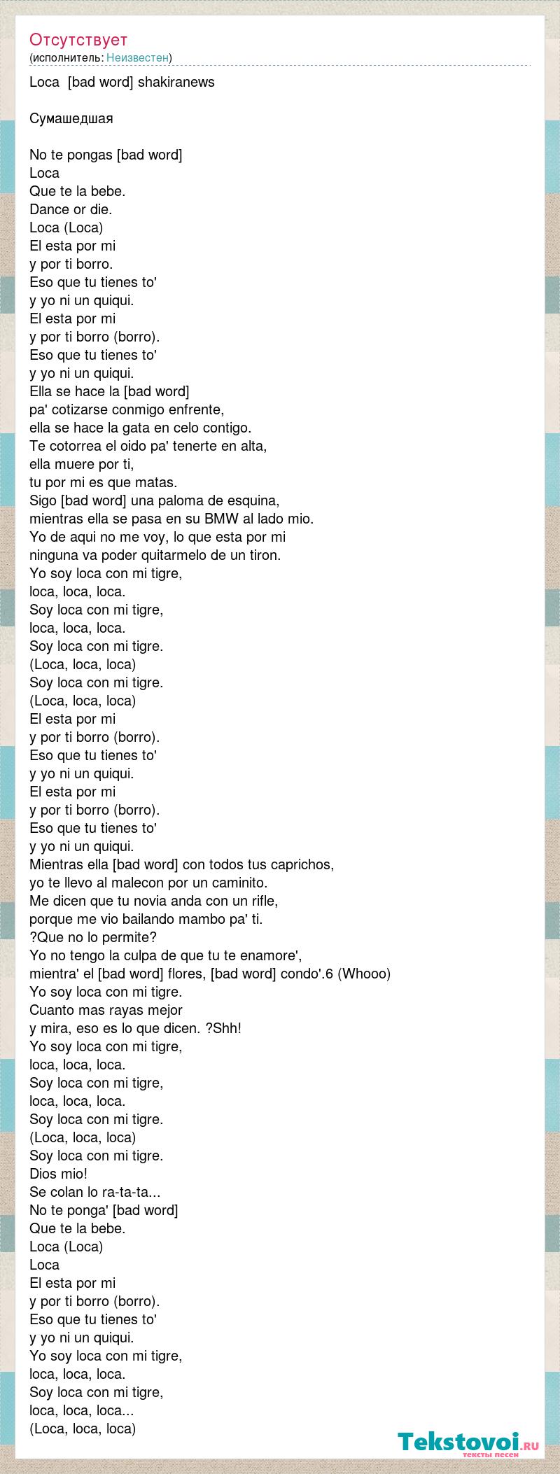 Loca [bad word] shakiranews Сумашедшая No te pongas [bad word] Loca Que te la bebe. Dance or die. Loca (Loca) El esta por mi y por ti borro. Eso que tu tienes to' y yo ni un quiqui. El esta por mi y por ti borro (borro). Eso que tu tienes to' y yo ni un quiqui. Ella se hace la [bad word] pa' cotizarse conmigo enfrente, ella se hace la gata en celo contigo. Te cotorrea el oido pa' tenerte en alta, ella muere por ti, tu por mi es que matas. Sigo [bad word] una paloma de esquina, mientras ella se pasa en su BMW al lado mio. Yo de aqui no me voy, lo que esta por mi ninguna va poder quitarmelo de un tiron. Yo soy loca con mi tigre, loca, loca, loca. Soy loca con mi tigre, loca, loca, loca. Soy loca con mi tigre. (Loca, loca, loca) Soy loca con mi tigre. (Loca, loca, loca) El esta por mi y por ti borro (borro). Eso que tu tienes to' y yo ni un quiqui. El esta por mi y por ti borro (borro). Eso que tu tienes to' y yo ni un quiqui. Mientras ella [bad word] con todos tus caprichos, yo te llevo al malecon por un caminito. Me dicen que tu novia anda con un rifle, porque me vio bailando mambo pa' ti. ?Que no lo permite? Yo no tengo la culpa de que tu te enamore', mientra' el [bad word] flores, [bad word] condo'.6 (Whooo) Yo soy loca con mi tigre. Cuanto mas rayas mejor y mira, eso es lo que dicen. ?Shh! Yo soy loca con mi tigre, loca, loca, loca. Soy loca con mi tigre, loca, loca, loca. Soy loca con mi tigre. (Loca, loca, loca) Soy loca con mi tigre. Dios mio! Se colan lo ra-ta-ta... No te ponga' [bad word] Que te la bebe. Loca (Loca) Loca El esta por mi y por ti borro (borro). Eso que tu tienes to' y yo ni un quiqui. Yo soy loca con mi tigre, loca, loca, loca. Soy loca con mi tigre, loca, loca, loca... (Loca, loca, loca)