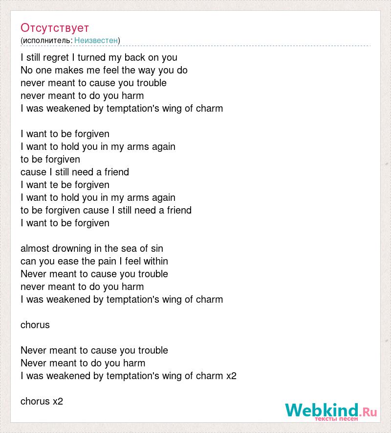 I still regret I turned my back on you No one makes me feel the way you do never meant to cause you trouble never meant to do you harm I was weakened by temptation's wing of charm I want to be forgiven I want to hold you in my arms again to be forgiven cause I still need a friend I want te be forgiven I want to hold you in my arms again to be forgiven cause I still need a friend I want to be forgiven almost drowning in the sea of sin can you ease the pain I feel within Never meant to cause you trouble never meant to do you harm I was weakened by temptation's wing of charm [bad word] Never meant to cause you trouble Never meant to do you harm I was weakened by temptation's wing of charm x2 [bad word] x2