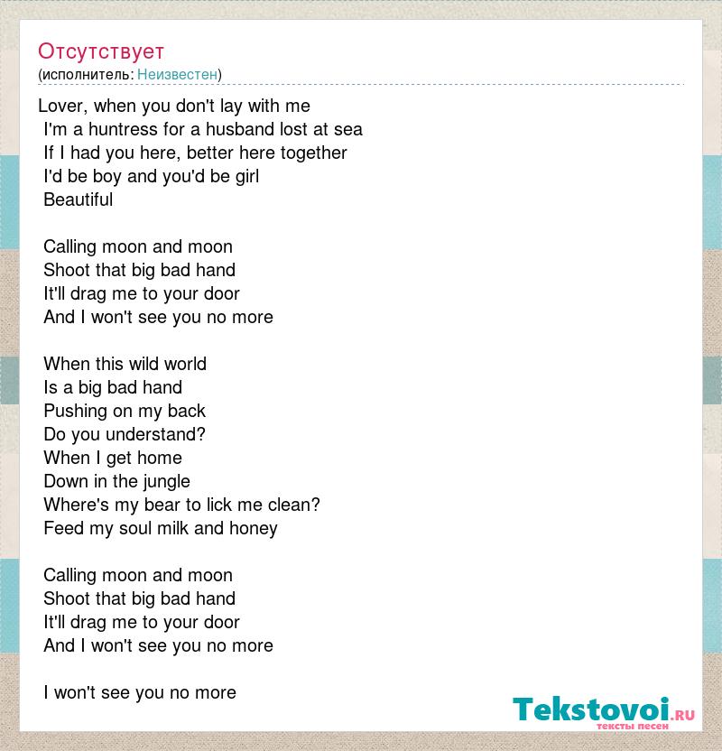 Lover, when you don't lay with me I'm a huntress for a husband lost at sea If I had you here, better here together I'd be boy and you'd be girl Beautiful Calling moon and moon Shoot that big bad hand It'll drag me to your door And I won't see you no more When this wild world Is a big bad hand Pushing on my back Do you understand? When I get home Down in the jungle Where's my bear to lick me clean? Feed my soul milk and honey Calling moon and moon Shoot that big bad hand It'll drag me to your door And I won't see you no more I won't see you no more