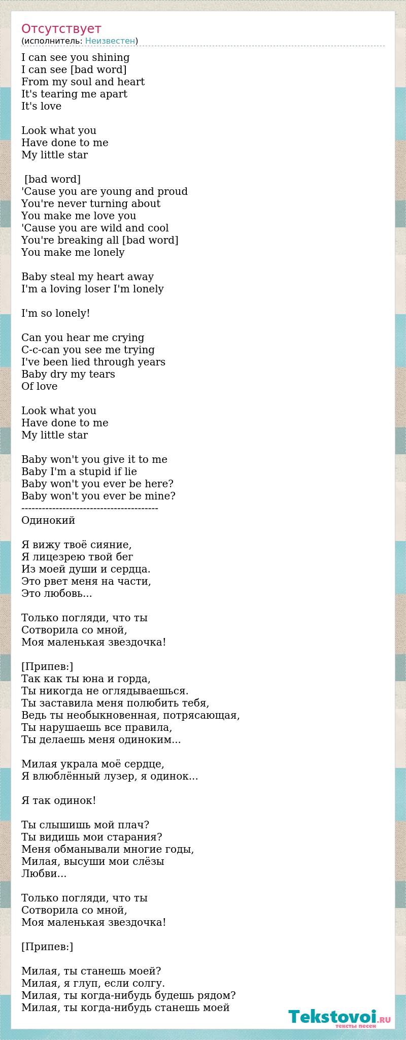 I can see you shining I can see [bad word] From my soul and heart It's tearing me apart It's love Look what you Have done to me My little star [bad word] 'Cause you are young and proud You're never turning about You make me love you 'Cause you are wild and cool You're breaking all [bad word] You make me lonely Baby steal my heart away I'm a loving loser I'm lonely I'm so lonely! Can you hear me crying C-c-can you see me trying I've been lied through years Baby dry my tears Of love Look what you Have done to me My little star Baby won't you give it to me Baby I'm a stupid if lie Baby won't you ever be here? Baby won't you ever be mine? ---------------------------------------- Одинокий Я вижу твоё сияние, Я лицезрею твой бег Из моей души и сердца. Это рвет меня на части, Это любовь... Только погляди, что ты Сотворила со мной, Моя маленькая звездочка! [Припев:] Так как ты юна и горда, Ты никогда не оглядываешься. Ты заставила меня полюбить тебя, Ведь ты необыкновенная, потрясающая, Ты нарушаешь все правила, Ты делаешь меня одиноким... Милая украла моё сердце, Я влюблённый лузер, я одинок... Я так одинок! Ты слышишь мой плач? Ты видишь мои старания? Меня обманывали многие годы, Милая, высуши мои слёзы Любви... Только погляди, что ты Сотворила со мной, Моя маленькая звездочка! [Припев:] Милая, ты станешь моей? Милая, я глуп, если солгу. Милая, ты когда-нибудь будешь рядом? Милая, ты когда-нибудь станешь моей