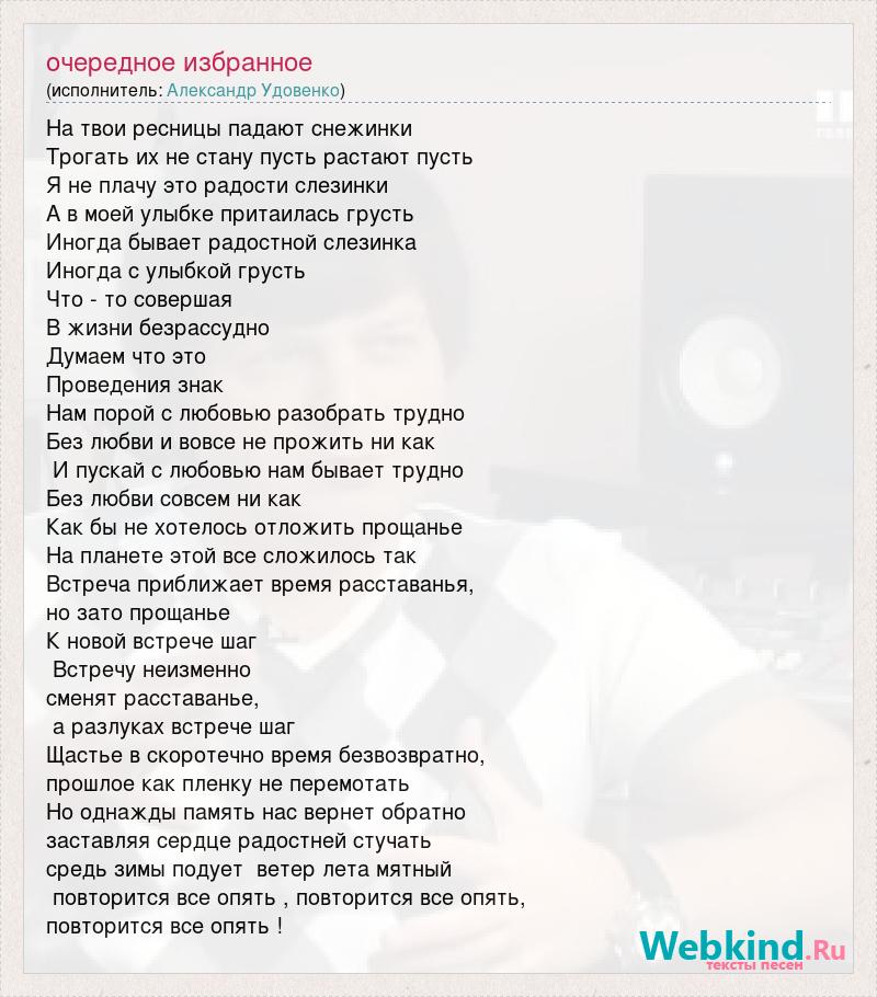 На твои ресницы падают снежинки Трогать их не стану пусть растают пусть Я не плачу это радости слезинки А в моей улыбке притаилась грусть Иногда бывает радостной слезинка Иногда с улыбкой грусть Что - то совершая В жизни безрассудно Думаем что это Проведения знак Нам порой с любовью разобрать трудно Без любви и вовсе не прожить ни как И пускай с любовью нам бывает трудно Без любви совсем ни как Как бы не хотелось отложить прощанье На планете этой все сложилось так Встреча приближает время расставанья, но зато прощанье К новой встрече шаг Встречу неизменно сменят расставанье, а разлуках встрече шаг Щастье в скоротечно время безвозвратно, прошлое как пленку не перемотать Но однажды память нас вернет обратно заставляя сердце радостней стучать средь зимы подует ветер лета мятный повторится все опять , повторится все опять, повторится все опять !
