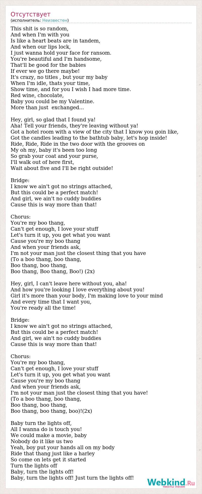 This [bad word] is so random, And when I'm with you Is like a heart beats are in tandem, And when our lips lock, I just wanna hold your face for ransom. You're beautiful and I'm handsome, That'll be good for the babies If ever we go there maybe! It's crazy, no titles , but your my baby When I'm idle, thats your time, Show time, and for you I wish I had more time. Red wine, chocolate, Baby you could be my Valentine. More than just exchanged... Hey, girl, so glad that I found ya! Aha! Tell your friends, they're leaving without ya! Got a hotel room with a view of the city that I know you goin like, Got the candles leading to the bathtub baby, let's hop inside! Ride, Ride, Ride in the two door with the grooves on My oh my, baby it's been too long So grab your coat and your purse, I'll walk out of here first, Wait about five and I'll be right outside! Bridge: I know we ain't got no strings attached, But this could be a perfect match! And girl, we ain't no cuddy buddies Cause this is way more than that! [bad word] You're my boo thang, Can't get enough, I love your stuff Let's turn it up, you get what you want Cause you're my boo thang And when your friends ask, I'm not your man just the closest thing that you have (To a boo thang, boo thang, Boo thang, boo thang, Boo thang, Boo thang, Boo!) (2x) Hey, girl, I can't leave here without you, aha! And how you're looking I love everything about you! Girl it's more than your body, I'm making love to your mind And every time that I want you, You're ready all the time! Bridge: I know we ain't got no strings attached, But this could be a perfect match! And girl, we ain't no cuddy buddies Cause this is way more than that! [bad word] You're my boo thang, Can't get enough, I love your stuff Let's turn it up, you get what you want Cause you're my boo thang And when your friends ask, I'm not your man just the closest thing that you have! (To a boo thang, boo thang, Boo thang, boo thang, Boo thang, boo thang, boo)!(2x) Baby turn the lights off, All I wanna do is touch you! We could make a movie, baby Nobody do it like us two Yeah, boy put your hands all on my body Ride that thang just like a harley [bad word] on lets get it started Turn the lights off Baby, turn the lights off! Baby, turn the lights off! Just turn the lights off!