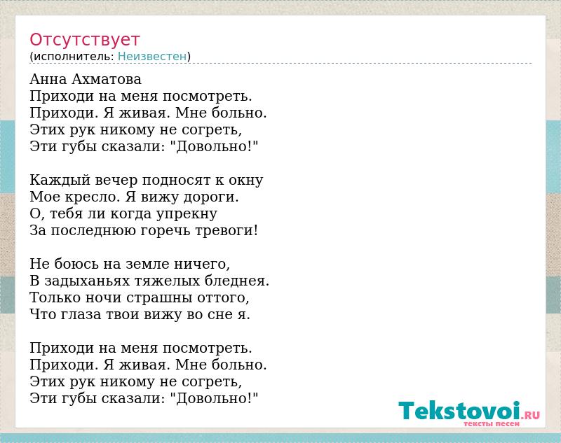 Анна Ахматова Приходи на меня посмотреть. Приходи. Я живая. Мне больно. Этих рук никому не согреть, Эти губы сказали: "Довольно!" Каждый вечер подносят к окну Мое кресло. Я вижу дороги. О, тебя ли когда упрекну За последнюю горечь тревоги! Не боюсь на земле ничего, В задыханьях тяжелых бледнея. Только ночи страшны оттого, Что глаза твои вижу во сне я. Приходи на меня посмотреть. Приходи. Я живая. Мне больно. Этих рук никому не согреть, Эти губы сказали: "Довольно!"