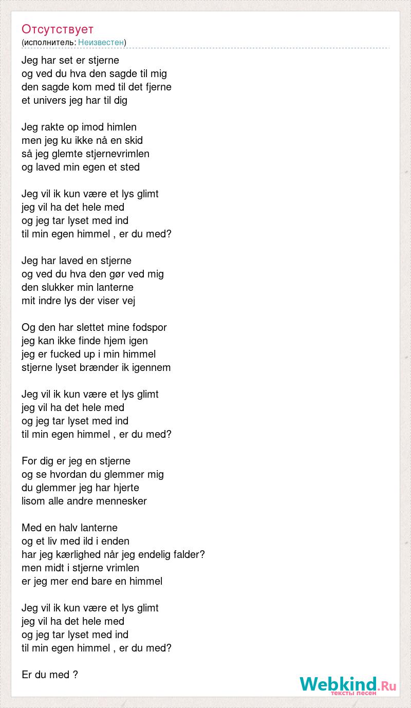 Jeg har set er stjerne og ved du hva den sagde til mig den sagde kom med til det fjerne et univers jeg har til dig Jeg rakte op imod himlen men jeg ku ikke nå en skid så jeg glemte stjernevrimlen og laved min egen et sted Jeg vil ik kun være et lys glimt jeg vil ha det hele med og jeg tar lyset med ind til min egen himmel , er du med? Jeg har laved en stjerne og ved du hva den gør ved mig den slukker min lanterne mit indre lys der viser vej Og den har slettet mine fodspor jeg kan ikke finde hjem igen jeg er [bad word] up i min himmel stjerne lyset brænder ik igennem Jeg vil ik kun være et lys glimt jeg vil ha det hele med og jeg tar lyset med ind til min egen himmel , er du med? For dig er jeg en stjerne og se hvordan du glemmer mig du glemmer jeg har hjerte lisom alle andre mennesker Med en halv lanterne og et liv med ild i enden har jeg kærlighed når jeg endelig falder? men midt i stjerne vrimlen er jeg mer end bare en himmel Jeg vil ik kun være et lys glimt jeg vil ha det hele med og jeg tar lyset med ind til min egen himmel , er du med? Er du med ?