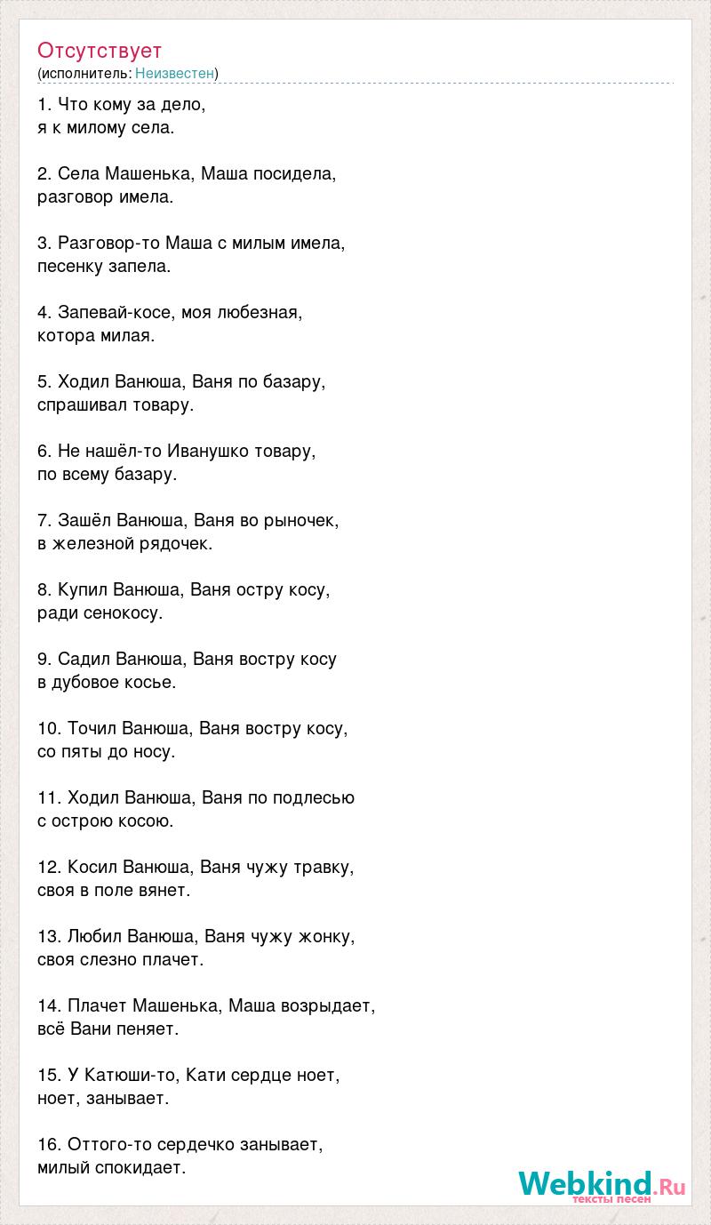 1. Что кому за дело, я к милому села. 2. Села Машенька, Маша посидела, разговор имела. 3. Разговор-то Маша́ с милым имела, песенку запела. 4. Запевай-косе, моя любезна́я, котора́ милая. 5. Ходил Ва́нюша, Ваня по базару, спрашивал товару. 6. Не нашёл-то Иванушко товару, по всему базару. 7. Зашёл Ва́нюша, Ваня во рыночек, в железно́й рядочек. 8. Купил Ва́нюша, Ваня остру косу, ради сенокосу. 9. Садил Ва́нюша, Ваня востру косу в дубовое косье. 10. Точил Ва́нюша, Ваня востру косу, со пяты до носу. 11. Ходил Ва́нюша, Ваня по подлесью с острою косою. 12. Косил Ва́нюша, Ваня чу́жу травку, сво́я в поле вянет. 13. Любил Ванюша, Ваня чу́жу жонку, сво́я слезно плачет. 14. Плачет Машенька, Маша возрыдает, всё Вани́ пеняет. 15. У Катюши-то, Кати сердце ноет, ноет, занывает. 16. Оттого-то сердечко занывает, милый спокидает.