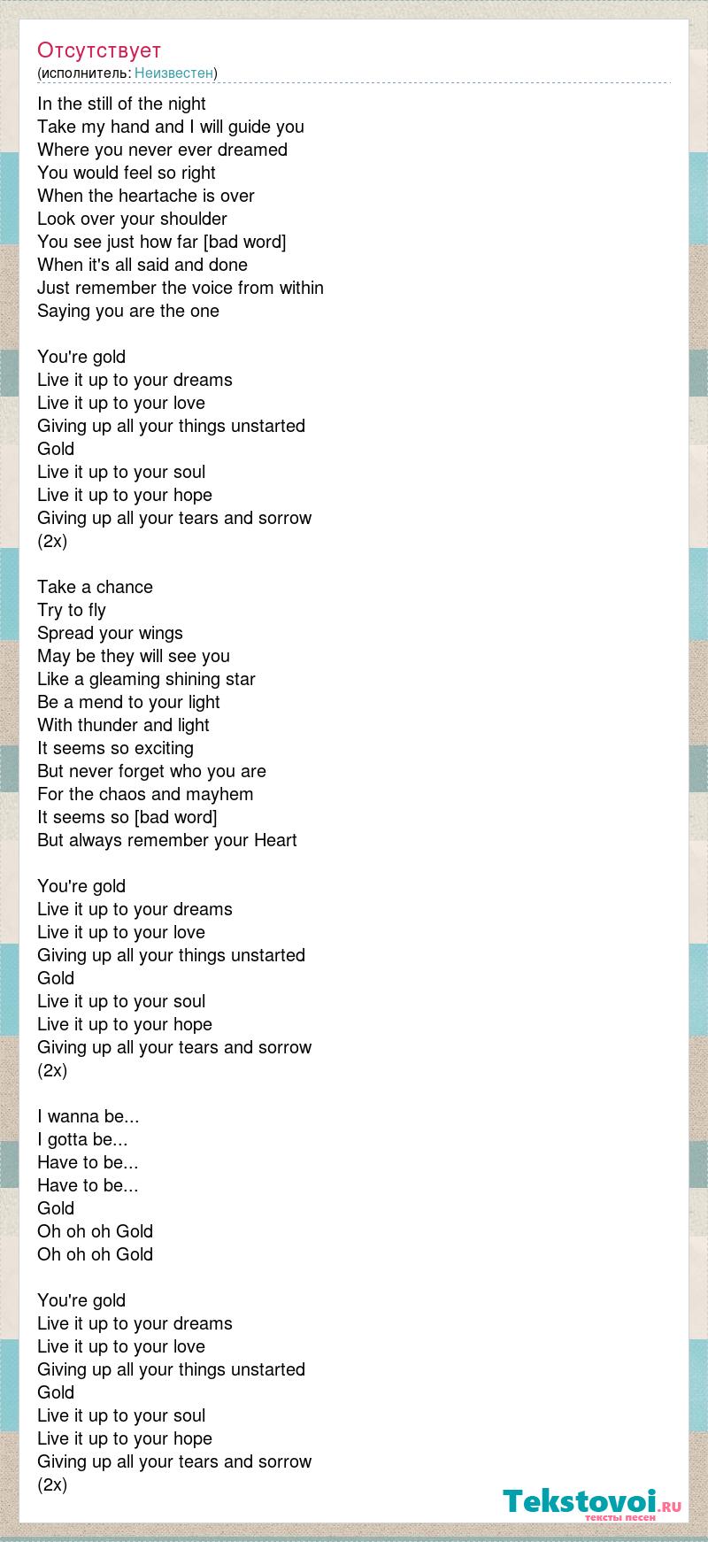 In the still of the night Take my hand and I will guide you Where you never ever dreamed You would feel so right When the heartache is over Look over your shoulder You see just how far [bad word] When it's all said and done Just remember the voice from within Saying you are the one You're gold Live it up to your dreams Live it up to your love Giving up all your things unstarted Gold Live it up to your soul Live it up to your hope Giving up all your tears and sorrow (2х) Take a chance Try to fly Spread your wings May be they will see you Like a gleaming shining star Be a mend to your light With thunder and light It seems so exciting But never forget who you are For the chaos and mayhem It seems so [bad word] But always remember your Heart You're gold Live it up to your dreams Live it up to your love Giving up all your things unstarted Gold Live it up to your soul Live it up to your hope Giving up all your tears and sorrow (2х) I wanna be... I gotta be... Have to be... Have to be... Gold Oh oh oh Gold Oh oh oh Gold You're gold Live it up to your dreams Live it up to your love Giving up all your things unstarted Gold Live it up to your soul Live it up to your hope Giving up all your tears and sorrow (2х)