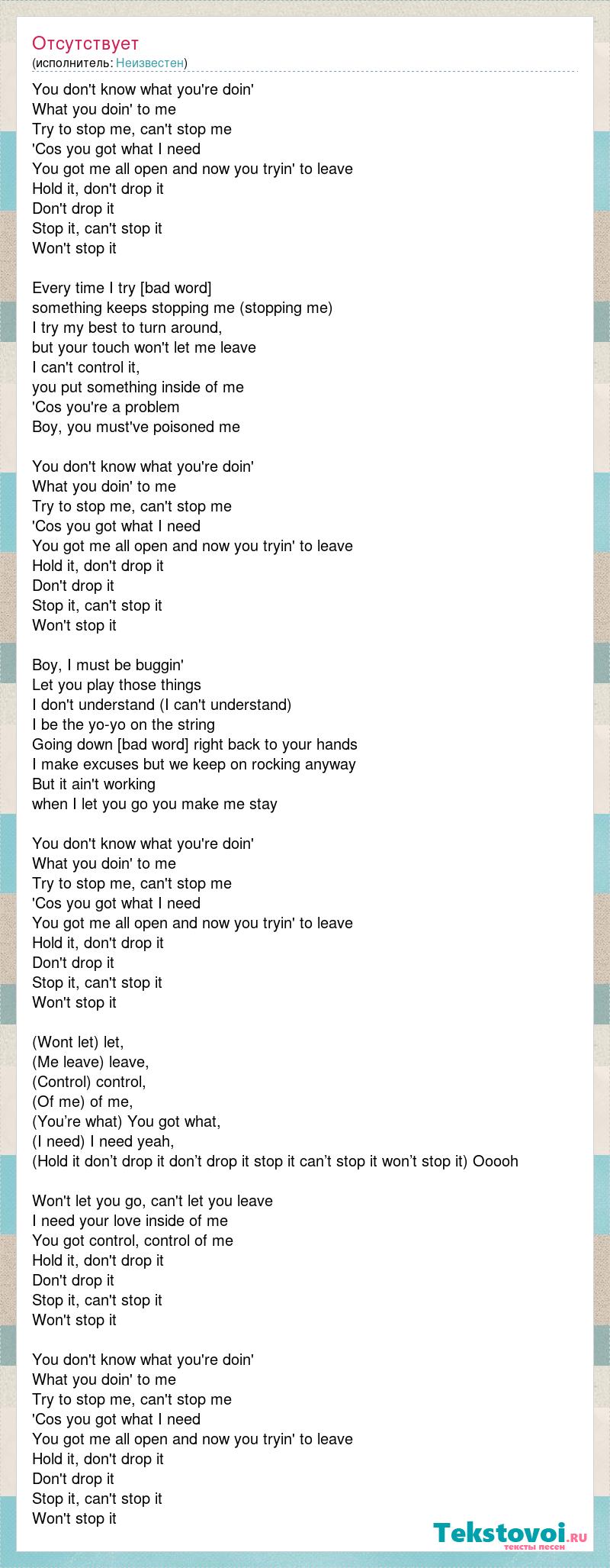 You don't know what you're doin' What you doin' to me Try to stop me, can't stop me 'Cos you got what I need You got me all open and now you tryin' to leave Hold it, don't drop it Don't drop it Stop it, can't stop it Won't stop it Every time I try [bad word] something keeps stopping me (stopping me) I try my best to turn around, but your touch won't let me leave I can't control it, you put something inside of me 'Cos you're a problem Boy, you must've poisoned me You don't know what you're doin' What you doin' to me Try to stop me, can't stop me 'Cos you got what I need You got me all open and now you tryin' to leave Hold it, don't drop it Don't drop it Stop it, can't stop it Won't stop it Boy, I must be buggin' Let you play those things I don't understand (I can't understand) I be the yo-yo on the string Going down [bad word] right back to your hands I make excuses but we keep on rocking anyway But it ain't working when I let you go you make me stay You don't know what you're doin' What you doin' to me Try to stop me, can't stop me 'Cos you got what I need You got me all open and now you tryin' to leave Hold it, don't drop it Don't drop it Stop it, can't stop it Won't stop it (Wont let) let, (Me leave) leave, (Control) control, (Of me) of me, (You’re what) You got what, (I need) I need yeah, (Hold it don’t drop it don’t drop it stop it can’t stop it won’t stop it) Ooooh Won't let you go, can't let you leave I need your love inside of me You got control, control of me Hold it, don't drop it Don't drop it Stop it, can't stop it Won't stop it You don't know what you're doin' What you doin' to me Try to stop me, can't stop me 'Cos you got what I need You got me all open and now you tryin' to leave Hold it, don't drop it Don't drop it Stop it, can't stop it Won't stop it