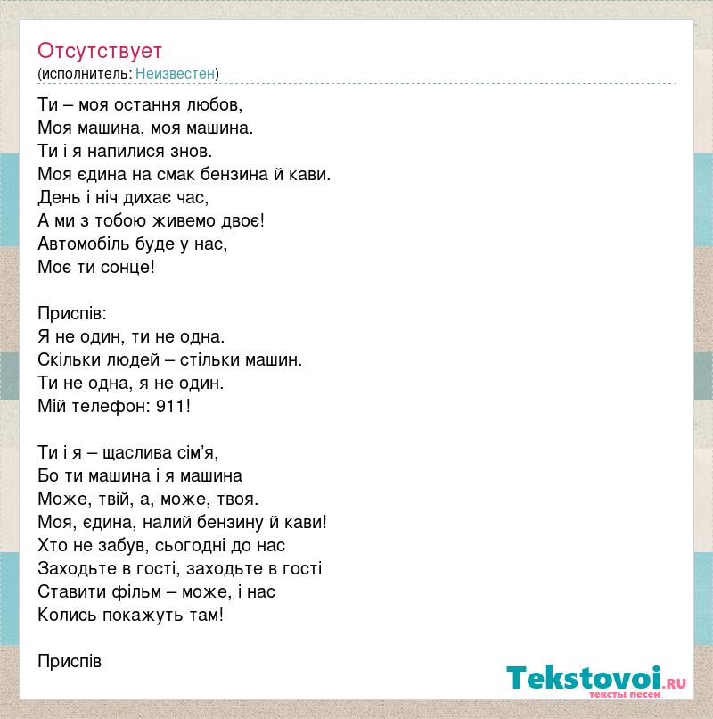 Ти – моя остання любов, Моя машина, моя машина. Ти і я напилися знов. Моя єдина на смак бензина й кави. День і ніч дихає час, А ми з тобою живемо двоє! Автомобіль буде у нас, Моє ти сонце! Приспів: Я не один, ти не одна. Скільки людей – стільки машин. Ти не одна, я не один. Мій телефон: 911! Ти і я – щаслива сім’я, Бо ти машина і я машина Може, твій, а, може, твоя. Моя, єдина, налий бензину й кави! Хто не забув, сьогодні до нас Заходьте в гості, заходьте в гості Ставити фільм – може, і нас Колись покажуть там! Приспів
