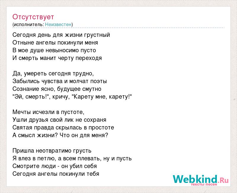 Сегодня день для жизни грустный Отныне ангелы покинули меня В мое душе невыносимо пусто И смерть манит черту переходя Да, умереть сегодня трудно, Забылись чувства и молчат поэты Сознание ясно, будущее смутно "Эй, смерть!", кричу, "Карету мне, карету!" Мечты исчезли в пустоте, Ушли друзья свой лик не сохраня Святая правда скрылась в простоте А смысл жизни? Что он для меня? Пришла неотвратимо грусть Я влез в петлю, а всем плевать, ну и пусть Смотрите люди - он убил себя Сегодня ангелы покинули тебя
