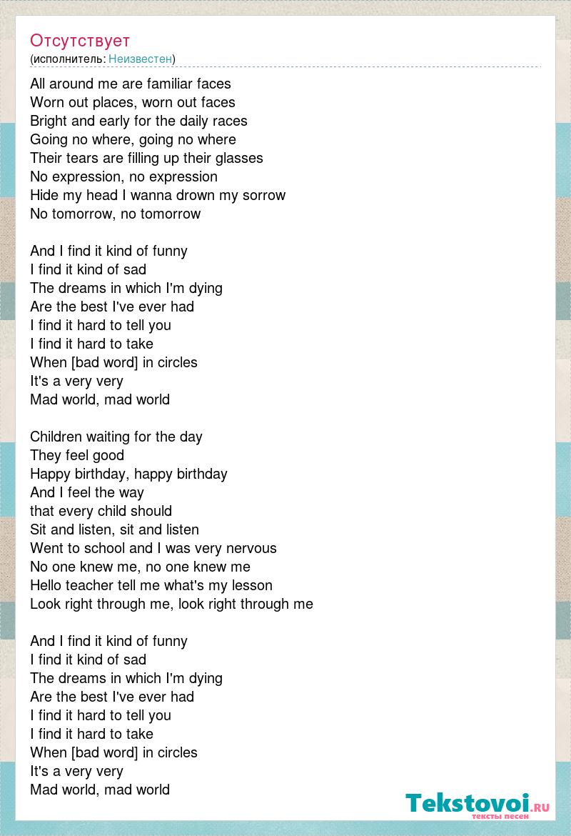 All around me are familiar faces Worn out places, worn out faces Bright and early for the daily races Going no where, going no where Their tears are filling up their glasses No expression, no expression Hide my head I wanna drown my sorrow No tomorrow, no tomorrow And I find it kind of funny I find it kind of sad The dreams in which I'm dying Are the best I've ever had I find it hard to tell you I find it hard to take When [bad word] in circles It's a very very Mad world, mad world Children waiting for the day They feel good Happy birthday, happy birthday And I feel the way that every child should Sit and listen, sit and listen Went to school and I was very nervous No one knew me, no one knew me Hello teacher tell me what's my lesson Look right through me, look right through me And I find it kind of funny I find it kind of sad The dreams in which I'm dying Are the best I've ever had I find it hard to tell you I find it hard to take When [bad word] in circles It's a very very Mad world, mad world