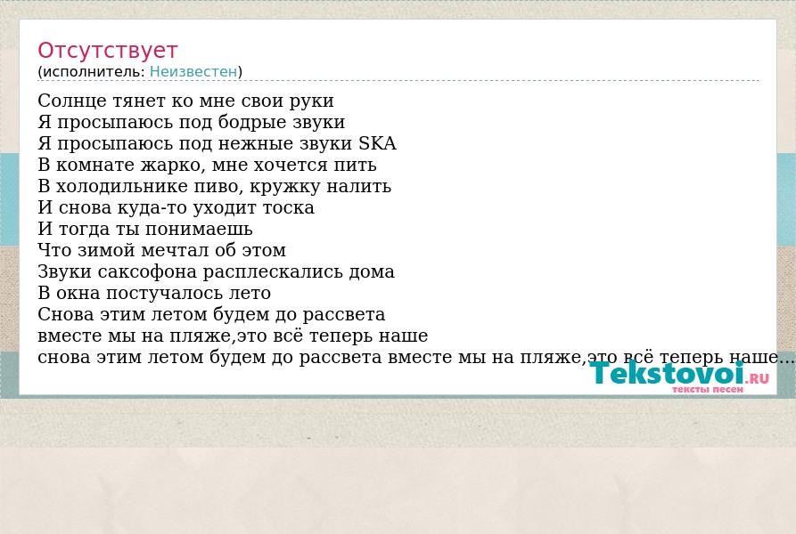 Солнце тянет ко мне свои руки Я просыпаюсь под бодрые звуки Я просыпаюсь под нежные звуки SKA В комнате жарко, мне хочется пить В холодильнике пиво, кружку налить И снова куда-то уходит тоска И тогда ты понимаешь Что зимой мечтал об этом Звуки саксофона расплескались дома В окна постучалось лето Снова этим летом будем до рассвета вместе мы на пляже,это всё теперь наше снова этим летом будем до рассвета вместе мы на пляже,это всё теперь наше...