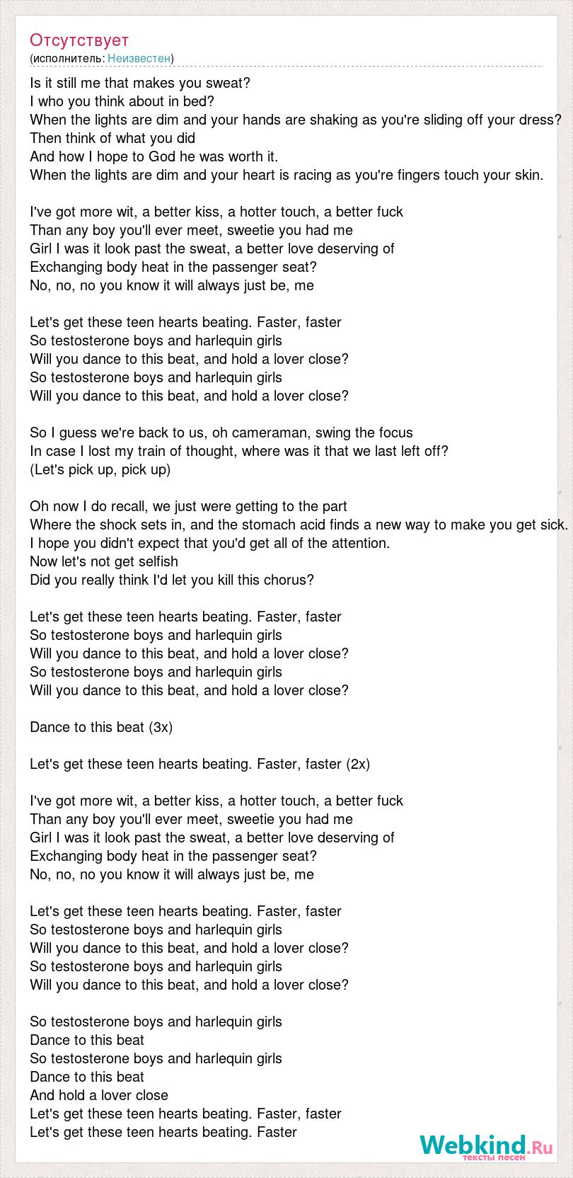 Is it still me that makes you sweat? I who you think about in bed? When the lights are dim and your hands are shaking as you're sliding off your dress? Then think of what you did And how I hope to God he was worth it. When the lights are dim and your heart is racing as you're fingers touch your skin. I've got more wit, a better kiss, a hotter touch, a better [bad word] Than any boy you'll ever meet, sweetie you had me Girl I was it look past the sweat, a better love deserving of Exchanging body heat in the passenger seat? No, no, no you know it will always just be, me Let's get these teen hearts beating. Faster, faster So testosterone boys and harlequin girls Will you dance to this beat, and hold a lover close? So testosterone boys and harlequin girls Will you dance to this beat, and hold a lover close? So I guess we're back to us, oh cameraman, swing the focus In case I lost my train of thought, where was it that we last left off? (Let's pick up, pick up) Oh now I do recall, we just were getting to the part Where the shock sets in, and the stomach acid finds a new way to make you get sick. I hope you didn't expect that you'd get all of the attention. Now let's not get selfish Did you really think I'd let you kill this [bad word] Let's get these teen hearts beating. Faster, faster So testosterone boys and harlequin girls Will you dance to this beat, and hold a lover close? So testosterone boys and harlequin girls Will you dance to this beat, and hold a lover close? Dance to this beat (3x) Let's get these teen hearts beating. Faster, faster (2x) I've got more wit, a better kiss, a hotter touch, a better [bad word] Than any boy you'll ever meet, sweetie you had me Girl I was it look past the sweat, a better love deserving of Exchanging body heat in the passenger seat? No, no, no you know it will always just be, me Let's get these teen hearts beating. Faster, faster So testosterone boys and harlequin girls Will you dance to this beat, and hold a lover close? So testosterone boys and harlequin girls Will you dance to this beat, and hold a lover close? So testosterone boys and harlequin girls Dance to this beat So testosterone boys and harlequin girls Dance to this beat And hold a lover close Let's get these teen hearts beating. Faster, faster Let's get these teen hearts beating. Faster