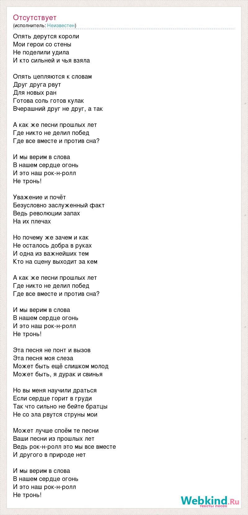 Опять дерутся короли Мои герои со стены Не поделили удила И кто сильней и чья взяла Опять цепляются к словам Друг друга рвут Для новых ран Готова соль готов кулак Вчерашний друг не друг, а так А как же песни прошлых лет Где никто не делил побед Где все вместе и против сна? И мы верим в слова В нашем сердце огонь И это наш рок-н-ролл Не тронь! Уважение и почёт Безусловно заслуженный факт Ведь революции запах На их плечах Но почему же зачем и как Не осталось добра в руках И одна из важнейших тем Кто на сцену выходит за кем А как же песни прошлых лет Где никто не делил побед Где все вместе и против сна? И мы верим в слова В нашем сердце огонь И это наш рок-н-ролл Не тронь! Эта песня не понт и вызов Эта песня моя слеза Может быть ещё слишком молод Может быть, я дурак и свинья Но вы меня научили драться Если сердце горит в груди Так что сильно не бейте братцы Не со зла рвутся струны мои Может лучше споём те песни Ваши песни из прошлых лет Ведь рок-н-ролл это мы все вместе И другого в природе нет И мы верим в слова В нашем сердце огонь И это наш рок-н-ролл Не тронь!