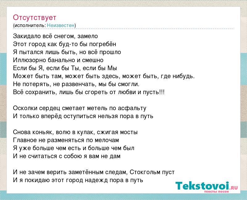 Закидало всё снегом, замело Этот город как буд-то бы погребён Я пытался лишь быть, но всё прошло Иллюзорно банально и смешно Если бы Я, если бы Ты, если бы Мы Может быть там, может быть здесь, может быть, где нибудь. Не потерять, не развенчать, мы бы смогли. Всё сохранить, лишь бы сгореть от любви и пусть!!! Осколки сердец сметает метель по асфальту И только вперёд оступиться нельзя пора в путь Снова коньяк, волю в кулак, сжигая мосты Главное не разменяться по мелочам Я уже больше чем есть и больше чем был И не считаться с собою я вам не дам И не зачем верить заметённым следам, Стокгольм пуст И я покидаю этот город надежд пора в путь