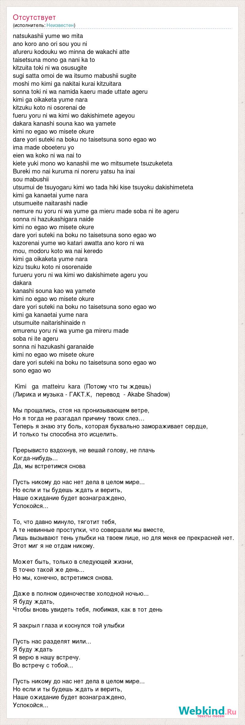 natsukashii yume wo mita ano koro ano ori sou you ni [bad word] kodouku wo minna de wakachi atte taisetsuna mono ga nani ka to kitzuita toki ni wa osusugite sugi satta omoi de wa itsumo mabushii sugite moshi mo kimi ga nakitai kurai kitzuitara sonna toki ni wa namida [bad word] made uttate [bad word] kimi ga oikaketa yume nara kitzuku koto ni osorenai de [bad word] yoru ni wa kimi wo dakishimete ageyou dakara kanashi souna kao wa yamete kimi no egao wo misete okure dare yori suteki na boku no taisetsuna sono egao wo ima made [bad word] yo eien wa koko ni wa nai to kiete yuki mono wo kanashii me wo mitsumete tsuzuketeta Bureki mo nai [bad word] ni [bad word] yatsu ha inai sou mabushii utsumui de [bad word] kimi wo tada hiki kise tsuyoku dakishimeteta kimi ga kanaetai yume nara utsumueite naitarashi nadie nemure nu [bad word] ni wa yume ga [bad word] made soba ni ite [bad word] sonna ni hazukashigara naide kimi no egao wo misete okure dare yori suteki na boku no taisetsuna sono egao wo kazorenai yume wo katari awatta ano koro ni wa mou, [bad word] koto wa nai keredo kimi ga oikaketa yume nara kizu tsuku koto ni osorenaide [bad word] yoru ni wa kimi wo dakishimete [bad word] you dakara kanashi souna kao wa yamete kimi no egao wo misete okure dare yori suteki na boku no taisetsuna sono egao wo kimi ga kanaetai yume nara utsumuite naitarishinaide n emurenu [bad word] ni wa yume ga [bad word] made soba ni ite [bad word] sonna ni hazukashi garanaide kimi no egao wo misete okure dare yori suteki na boku no taisetsuna sono egao wo sono egao wo Kimi ga [bad word] kara (Потому что ты ждешь) (Лирика и музыка - ГАКТ.К, перевод - Akabe Shadow) Мы прощались, стоя на пронизывающем ветре, Но я тогда не разгадал причину твоих слез… Теперь я знаю эту боль, которая буквально замораживает сердце, И только ты способна это исцелить. Прерывисто вздохнув, не вешай голову, не плачь Когда-нибудь... Да, мы встретимся снова Пусть никому до нас нет дела в целом мире... Но если и ты будешь ждать и верить, Наше ожидание будет вознаграждено, Успокойся... То, что давно минуло, тяготит тебя, А те невинные проступки, что совершали мы вместе, Лишь вызывают тень улыбки на твоем лице, но для меня ее прекрасней нет. Этот миг я не отдам никому. Может быть, только в следующей жизни, В точно такой же день... Но мы, конечно, встретимся снова. Даже в полном одиночестве холодной ночью... Я буду ждать, Чтобы вновь увидеть тебя, любимая, как в тот день Я закрыл глаза и коснулся той улыбки Пусть нас разделят мили... Я буду ждать Я верю в нашу встречу. Во встречу с тобой... Пусть никому до нас нет дела в целом мире... Но если и ты будешь ждать и верить, Наше ожидание будет вознаграждено, Успокойся...