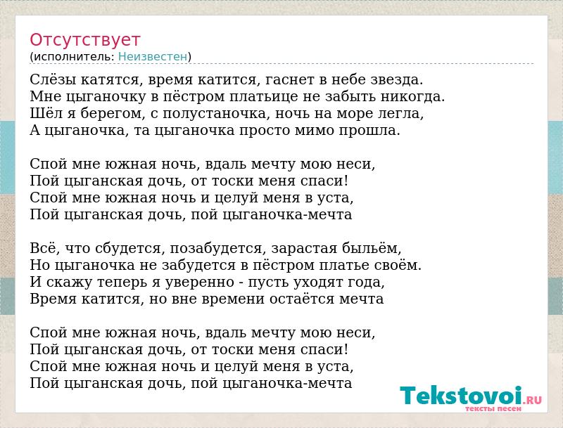Слёзы катятся, время катится, гаснет в небе звезда. Мне цыганочку в пёстром платьице не забыть никогда. Шёл я берегом, с полустаночка, ночь на море легла, А цыганочка, та цыганочка просто мимо прошла. Спой мне южная ночь, вдаль мечту мою неси, Пой цыганская дочь, от тоски меня спаси! Спой мне южная ночь и целуй меня в уста, Пой цыганская дочь, пой цыганочка-мечта Всё, что сбудется, позабудется, зарастая быльём, Но цыганочка не забудется в пёстром платье своём. И скажу теперь я уверенно - пусть уходят года, Время катится, но вне времени остаётся мечта Спой мне южная ночь, вдаль мечту мою неси, Пой цыганская дочь, от тоски меня спаси! Спой мне южная ночь и целуй меня в уста, Пой цыганская дочь, пой цыганочка-мечта
